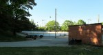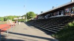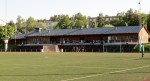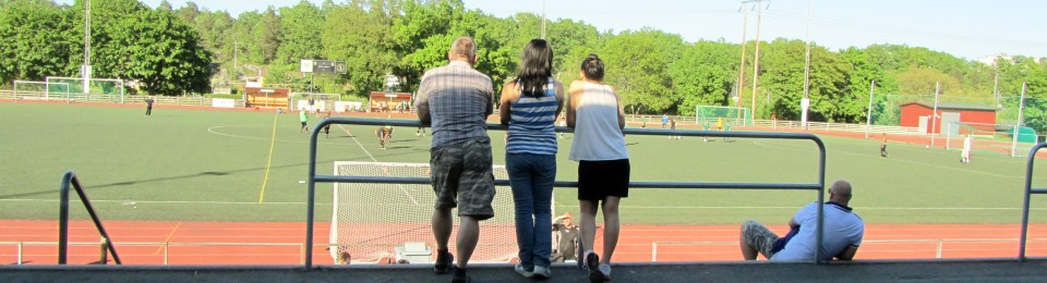 Hagsätra IP is a pleasant enough location set amongst the trees in suburban Stockholm. The train we’d arrived on rumbled away beyond the far side, and a cafe in the changing room block lost out on some business by closing up early. There’s an uncovered terrace on the near side, and an ice rink (also uncovered) beyond one goal, but no cover save for a tiny overhang on the changing room block. Not an issue on a warm evening with a barely a cloud in the sky.