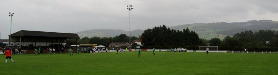 Whilst Maes Y Dre was never really up to Welsh Premier ground standards, the ground being shared with cricket, there’s a lot to like here. The most obvious is the large pitched-roof stand, although you do have to be careful how you pick your seat, some are broken, others have little leg-room, it offered plenty of cover on a wet day. The cricket pavilion balcony on an opposite corner also served useful purpose. Behind and to the left The Long Mountain (Cefn Digoll) provided a spectacular backdrop.