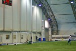 Despite the fact that officially there were to be no spectators, there were a few parents half watching and well-liked hopper Dermot managed to amble past the reception desk. Many watched the game from the warmth of the canteen, which was spacious, well equipped and closed. I’m no fan of watching behind glass so I ventured pitchside and was immediately struck how cold it was. It transpires that the two pitches are only separated from the outside world by a framework covered by a waterproof canvas-type cloth. Every so often outside a lump of snow would slide off of the canvas with a hiss.