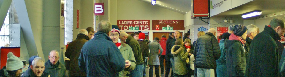 The ground is situated a mere 500 yards from the North Sea, there’s just the King’s Links golf course between the stadium and the beach, so sat in the Main stand I was glad of the Richard Donald stand to shelter me from the North winds! Initially I’d wondered whether paying top price was a worthwhile investment, but the extra fiver was worth it, just to explore the two tiered concourse, and fall in love with the railway style signage. That said, the seating is cramped, and the lack of leg-room would be real issue if the attendance had been anywhere near the capacity of 22,199. As it was people have learned to make use of the spare capacity and spread out a little!