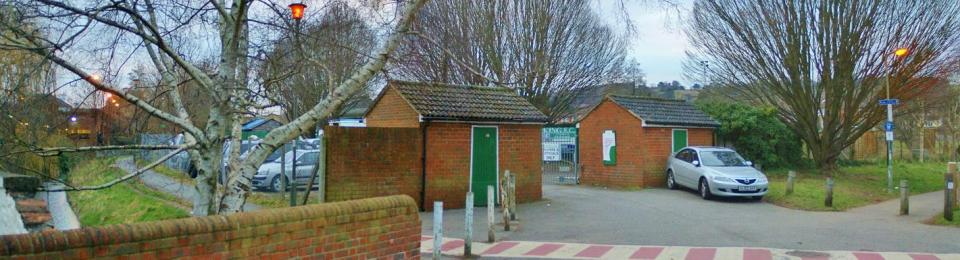 There’s nothing remotely Cubitt-inspired about Dorking’s football ground. The influences here are the needs of the Isthmian League, one notch higher up the pecking order than the club’s present status, the club leaving the Isthmian League when that competition disbanded their Division Two at the end of the 2005/6 season. What’s left is a gorgeous 200 seat stand dating from the ground’s opening in 1956, and shallow terracing on most of the other sides. On the far side there’s the asbestos and concrete covered enclosure seen at so many Isthmian League grounds. It’s slowly being grasped by the ivy, but the club badge can still be seen, the famous Dorking chicken, popular on Victorian dining tables, and identifiable from the breed having five claws rather than the normal four.