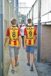 The location of Achter de Kazerne is both the pitfall and the beauty of the ground, as its perched in the middle of the suburbs, cheek by jowl with housing and the occasional small business. It’s a nightmare to Police, and with Standard Liège the visitors the game had been declared as a “Risk” game. That phrase should worry any hopper fancying taking in a Belgian top-flight game. It means there will be severe restrictions on who can buy tickets, and often there will be no online sales, or sales to foreigners. We’d had a kind offer from a Belgian-based hopper to buy us tickets, but online sales were permitted. There was, however a nasty moment when at the ticket office, our passports were examined and we were told to wait for a minute or so, before our tickets were handed over.