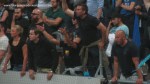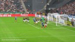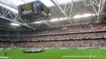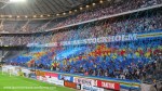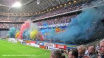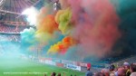 In a highly choreographed display the DIF fans firstly waved flags, then those on the top two sections threw streamers before the front of the bottom two decks started a huge display of multi=coloured smoke bombs. All very colourful, but in a stadium with a retractable rood the gap for smoke dispersal was limited so kick-off was delayed 15 minutes until the TV producers were happy that the cameras could see.