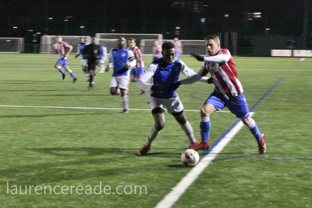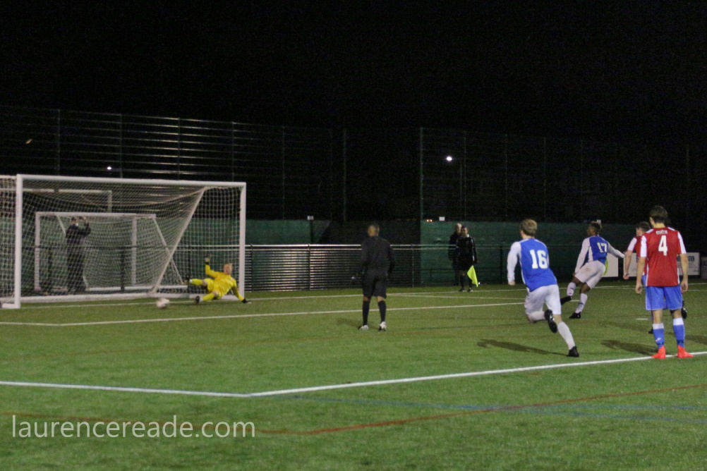 The game was a real curate’s egg, with at times superb football punctuated by almost comical errors. For a long time the two early strikes looked to have provided the only goals. Charlie Heatley didn’t miss his penalty, it was beautifully saved by Wilkinson Boateng whose man-of-the-match performance was the major reason Newham got something out of this game. But then Charlie Fairhead knocked in what most most have thought was the winner for Frenford, only for Newham to win a penalty with their first attack after the restart! That was converted by Richard Kone, and he was so keen was he to get the ball back for the restart that he collected his second yellow card in a scuffle with home keeper Lewis Greene.