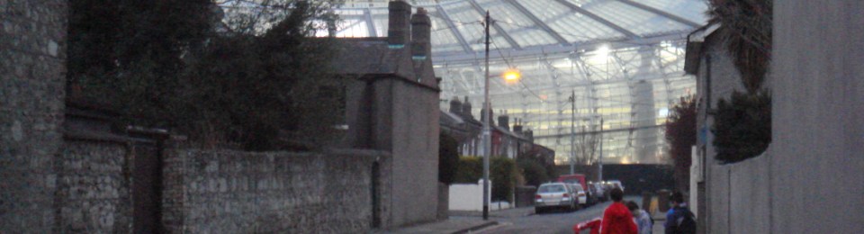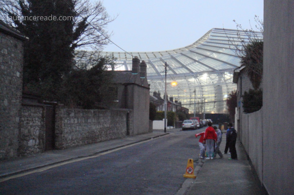 But the compromise at Havelock Square did give me possibly the favourite photo I’ve ever taken. My little camera spent this Irish tour dying, the vertical hold on the sensor was going and roughly only one photo in ten was coming out anything other than unusably blurred. But as we walked past Havelock Square I spotted a group of small boys kicking a football with the space age stadium as a backdrop. I’m sure you can read all you need to into the picture!