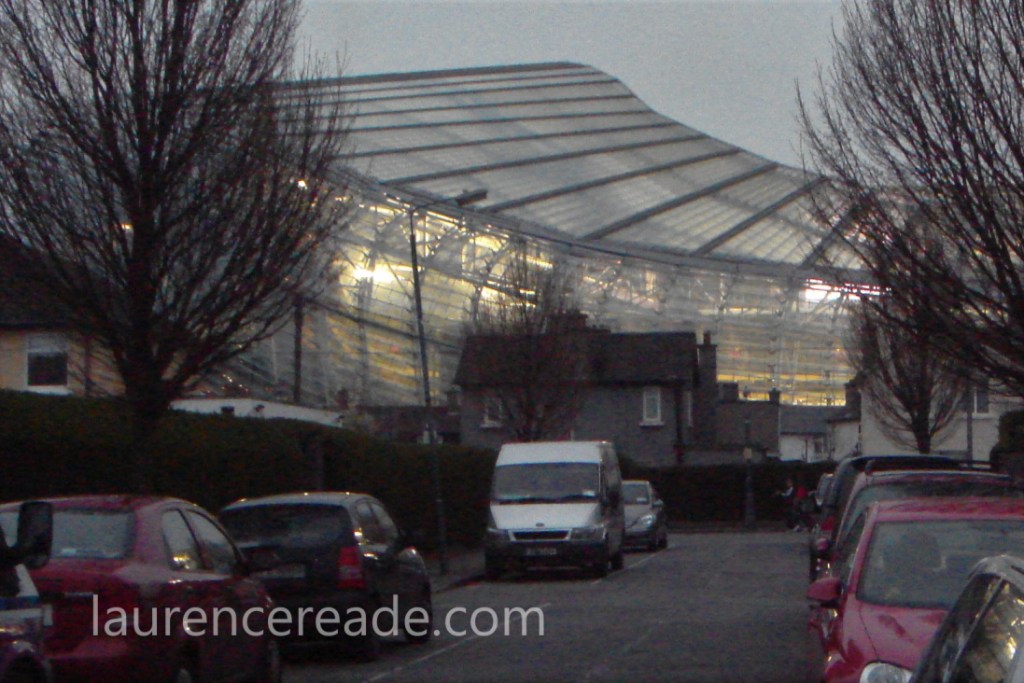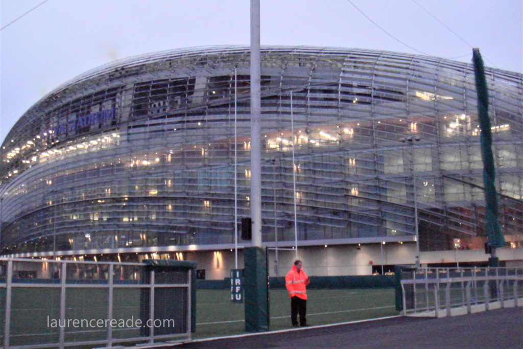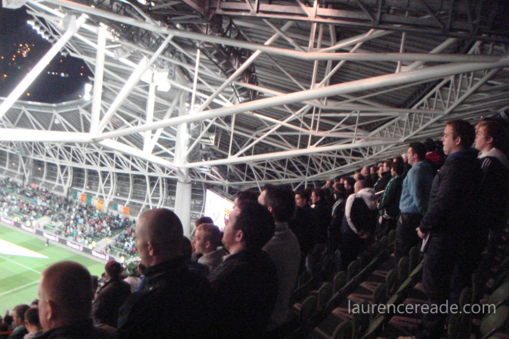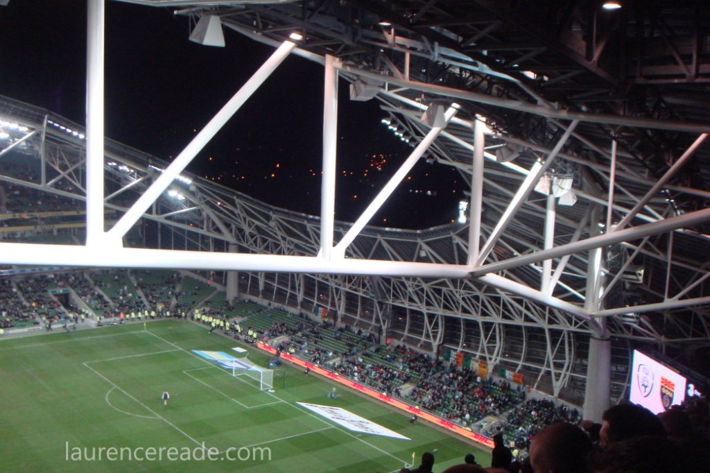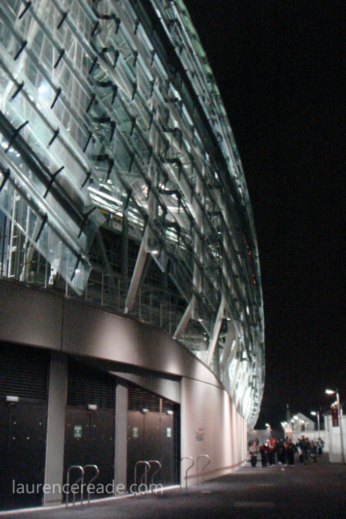 Having to factor in time for ticket purchases was an unwelcome development so it was fortunate we parked both quickly and conveniently at Clanna Gael Fontenoy GAA Club, in Dublin’s Irishtown district. The walk across did build up that sense of anticipation and the translucent panels of the stadium cladding were beginning to glow under the floodlights.