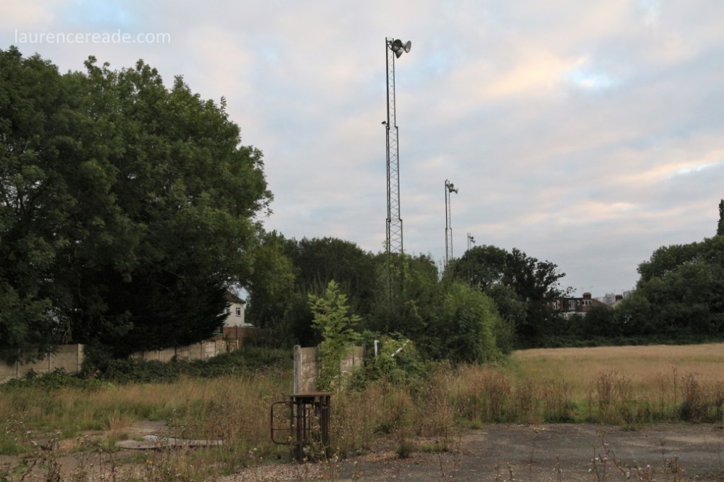 The club became Woodford Town 2017 for the start of the 2017/18 season, dropping the 2017 suffix two years ago. They groundshared in a similarly nomadic fashion to the first club but now had a more substantial identity, and an aim- to return home to Woodford Green. The twist was, and still is that the old ground, Snakes Lane, is still in situ and has lain derelict for over 25 years! A fire just after the eviction saw the clubhouse razed but even now the surrounding walls, floodlights and even a turnstile are still in situ. The old ground is a short walk from the new, under the M11 and over the River Roding, and I joined a steady succession of groundhoppers in having a look round. I’d go as far as to say if you want to understand Woodford Town’s new ground, go and have a look round the old one first.