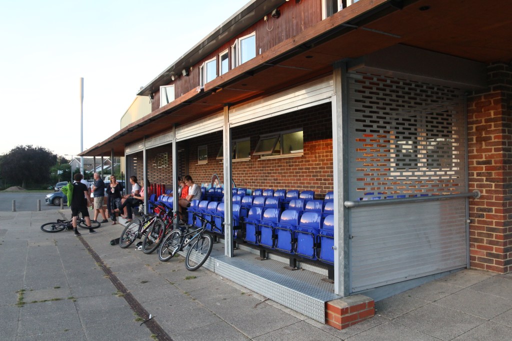 Take the entrance, and the sign “Right of way.” I know Longwell Green Sports managed to divert a public footpath in order to full enclose their ground but I also know just how difficult it is to get that done. Of course, that has a knock-on effect in terms of ground grading, and you see the issues on other places too, the seated stand is set back a substantial way back from the pitch side rail so if you want to sit, and have a good view of the game, then take a blanket and sit on the grass banking. You will of course hope for good weather! You do get the impression that if Storrington were to be promoted from the Step 6 Southern Combination Division One, then the ground as it is would become a real issue for them.