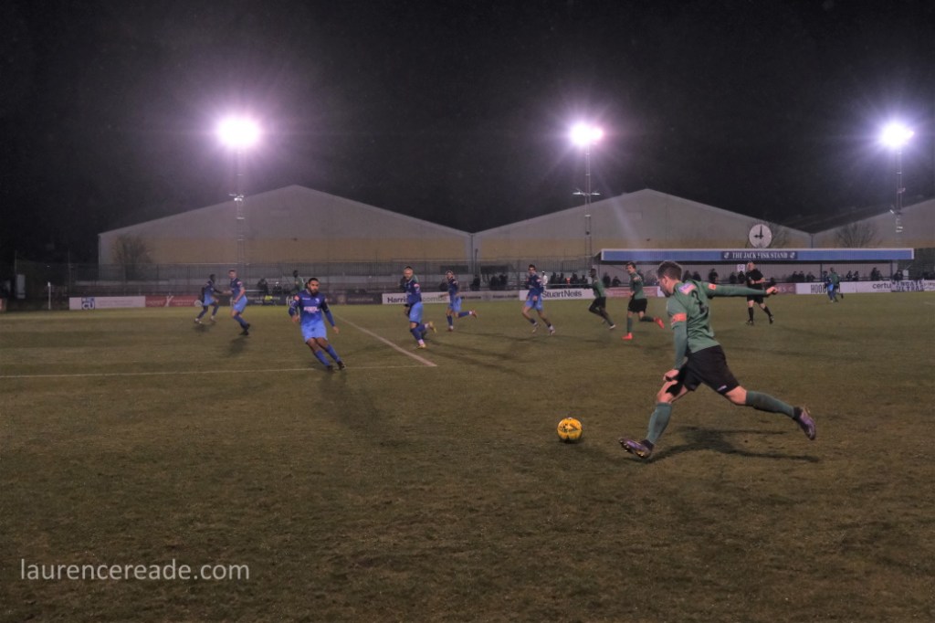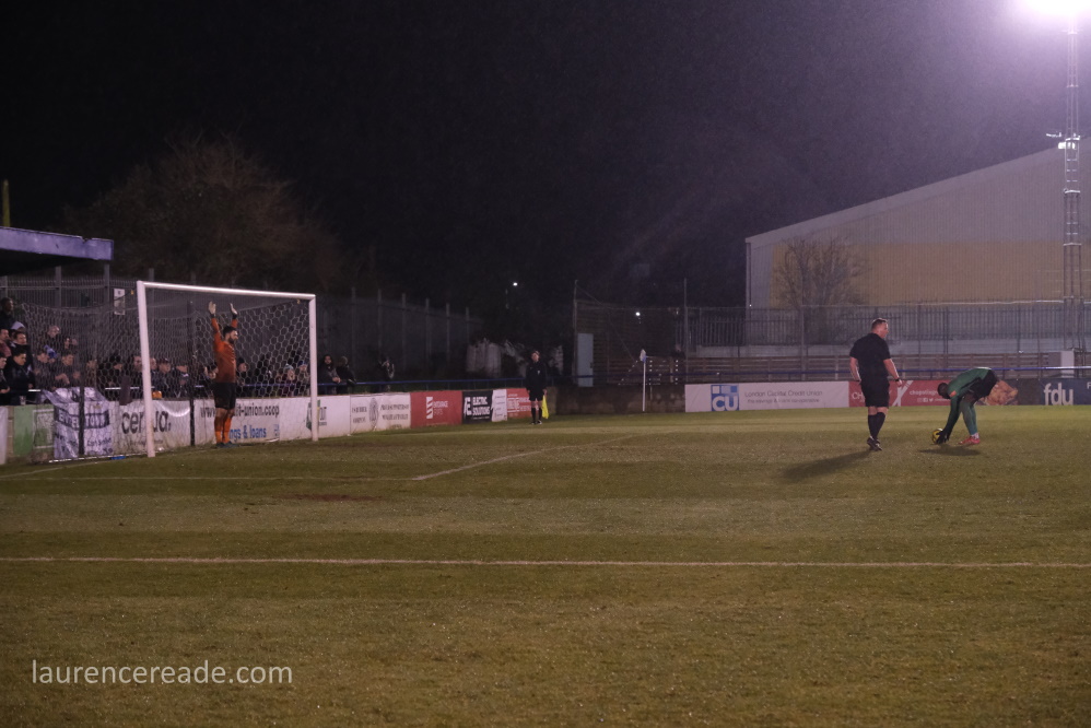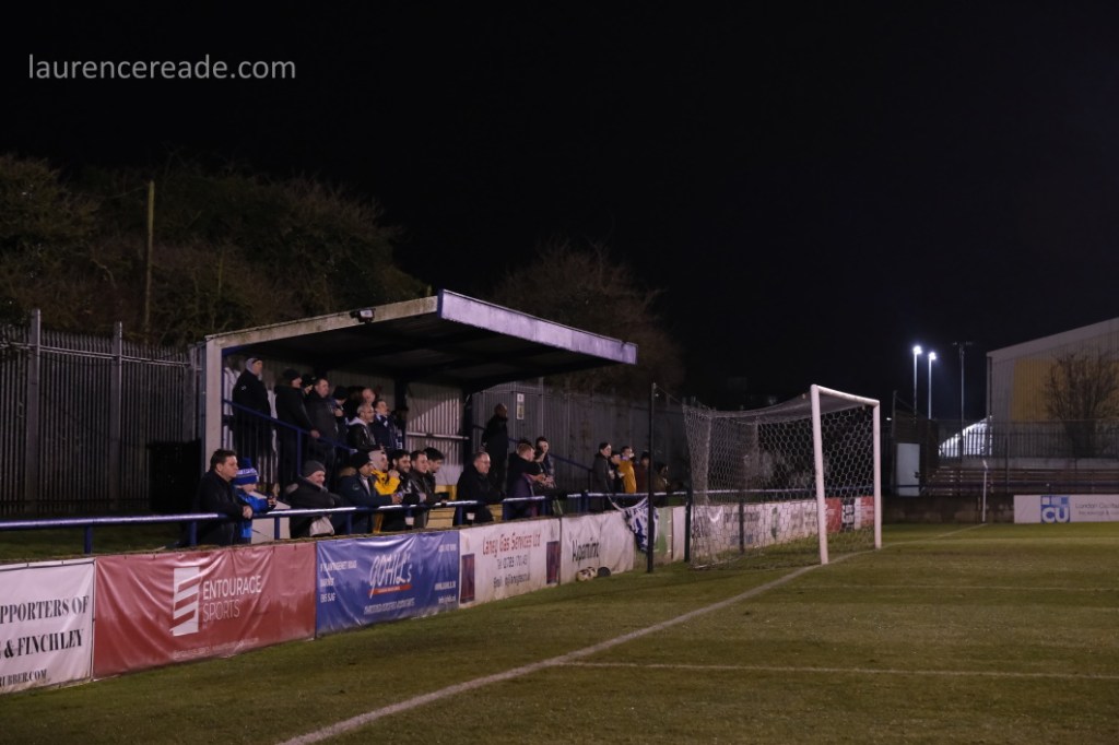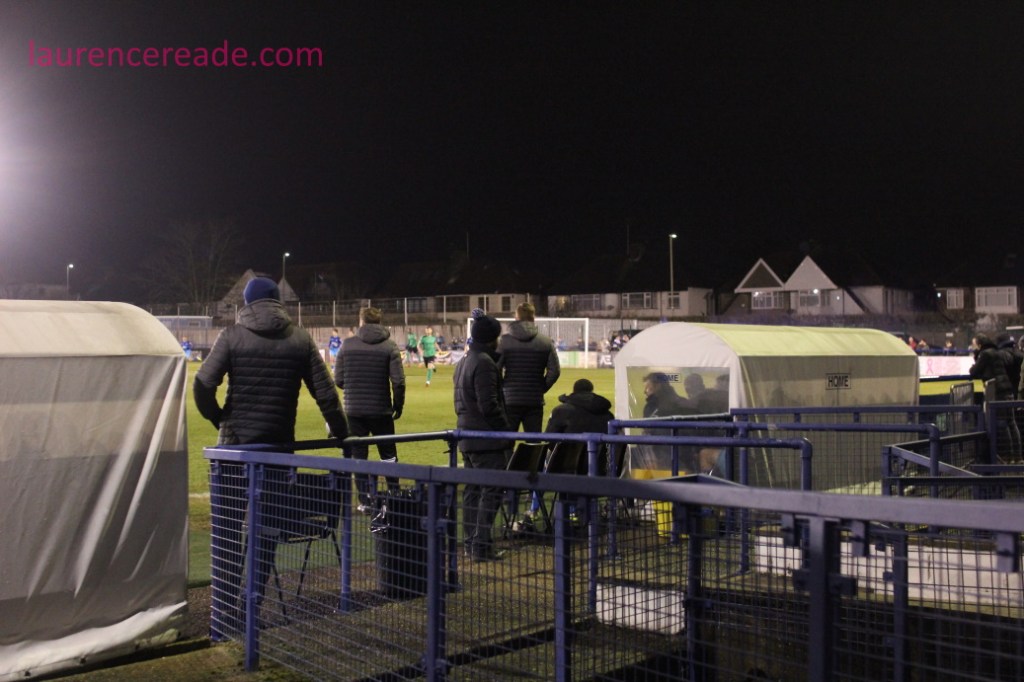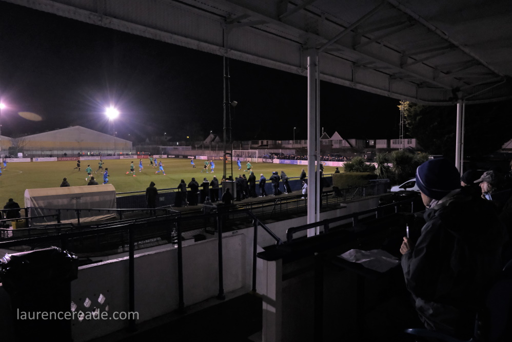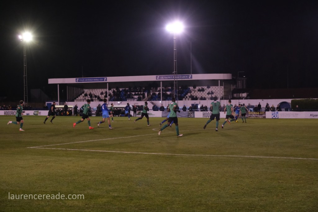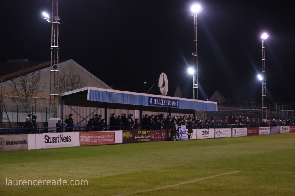 It took a little time to negotiate the turnstiles not helped by a group of young lads trying to claim that could get in as children, and yes I did see them all holding pint glasses at half time! The surprise was just how well Wingate & Finchley did against a side aiming for National League South football. The normally prolific Muhammadu Faal had an off-night missing a penalty, and for Wingate Antonis Vasilou celebrated his loan from Barnet being extended to the end of the season with a brace, the second a thunderbolt from 30 yards.