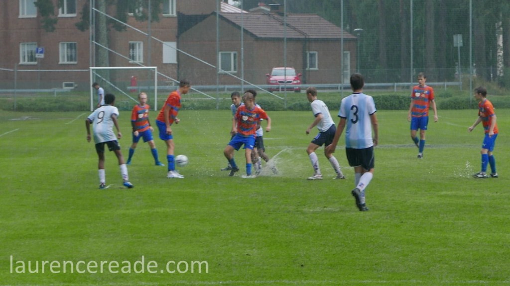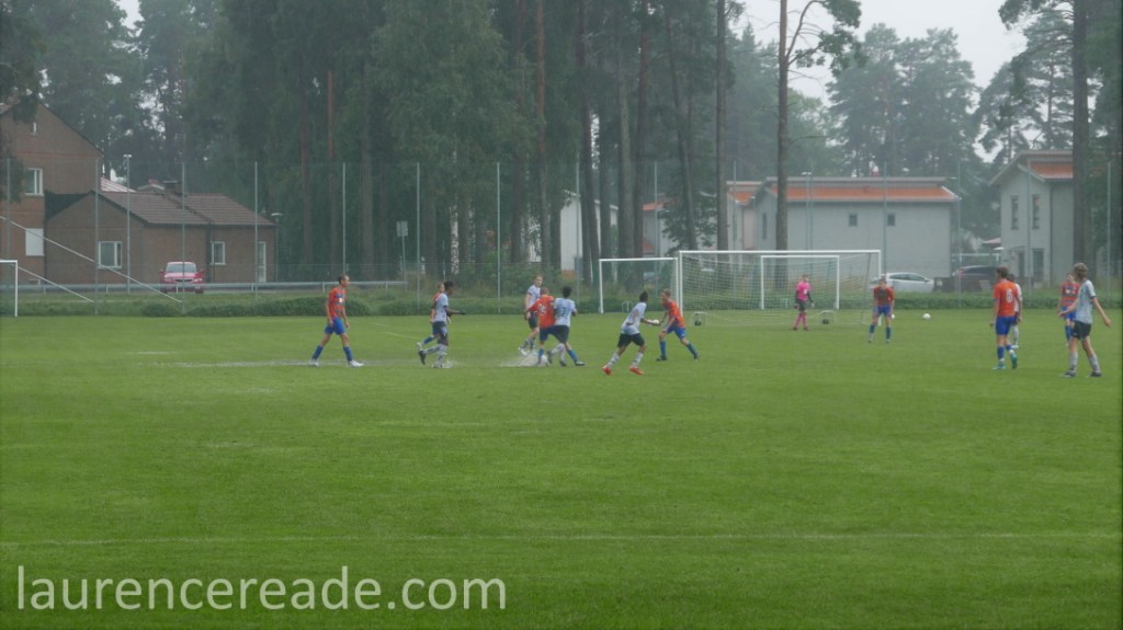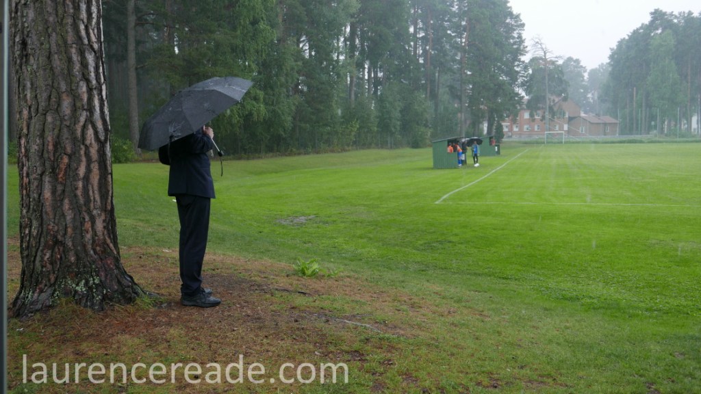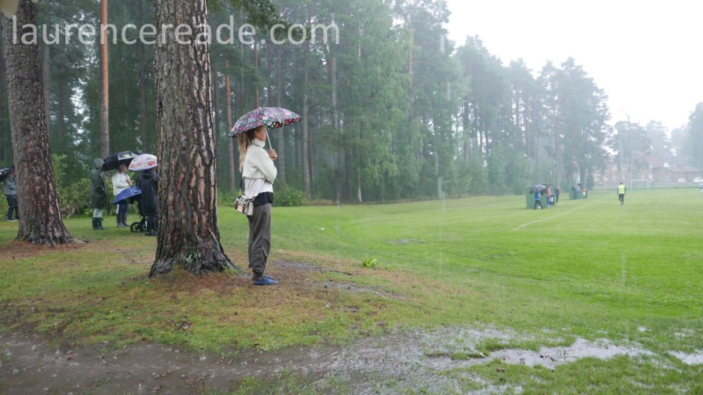 Eventually a table was used sideways as a makeshift dam which helped those serving, diverted the water onto an already sodden pitch. Swedish football does come with a reputation of postponing games if conditions aren’t perfect but perhaps this was the exception that proved the rule, and both sides contributed to an entertaining game, even if Robyn did have the best idea of the day. She watched the second half of the game from the bus shelter for the trip back into town.