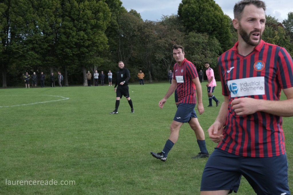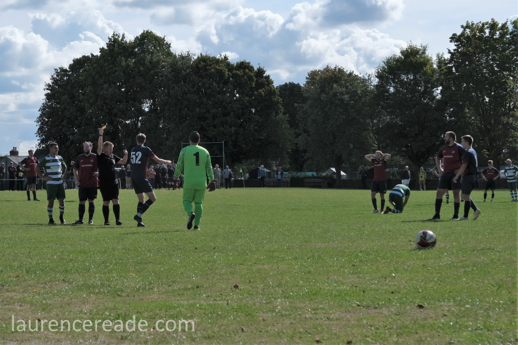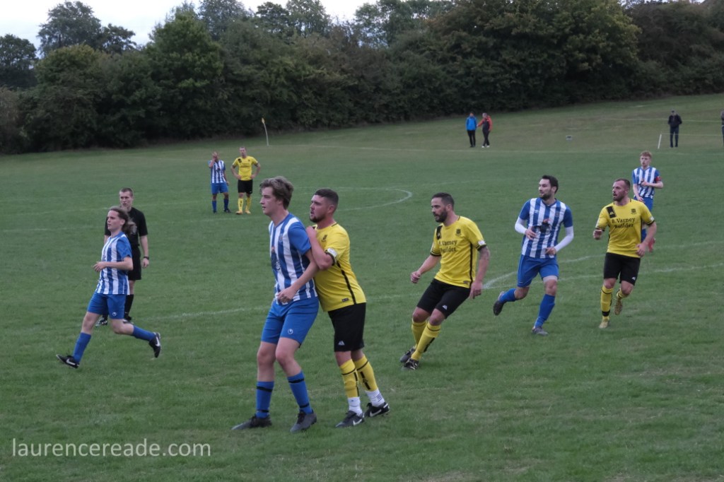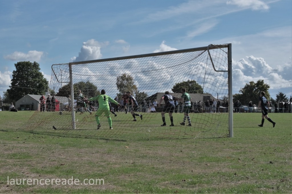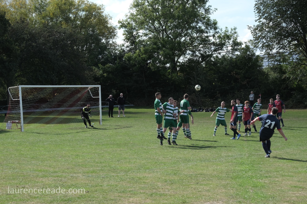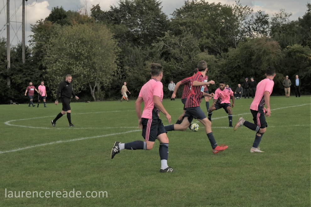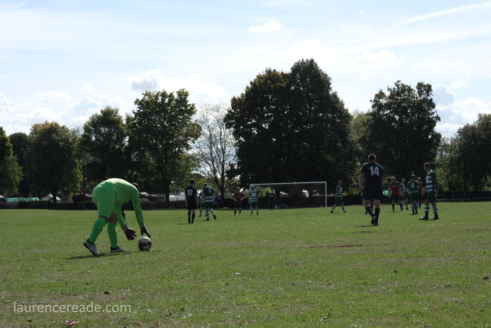 Last season Hatherop’s visit to Sherborne Harriers caused a certain amount of consternation amongst some groundhoppers. Back then what we saw was their reserves, but the firsts soon scratched from the Swindon & District League, so it was really only a matter of time. That hop game was the only loss Hatherop FC suffered on their way to the divisional championship and a double promotion. Here they won well despite the early loss of Shaun Skinner, to a dismissal for a stamp that was well spotted by eagle-eyed referee Steve Wilkes.