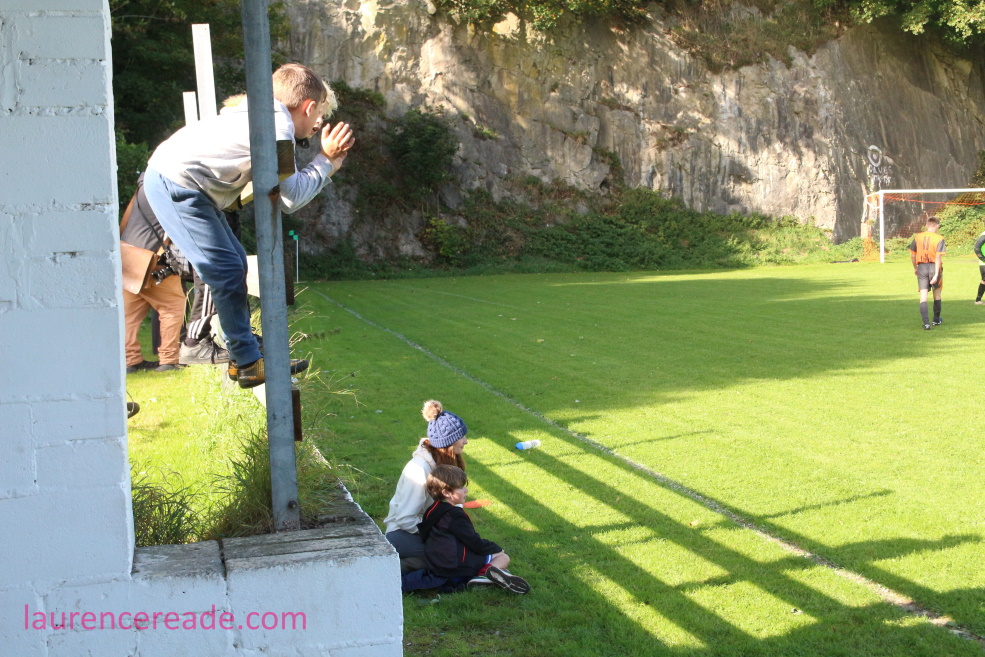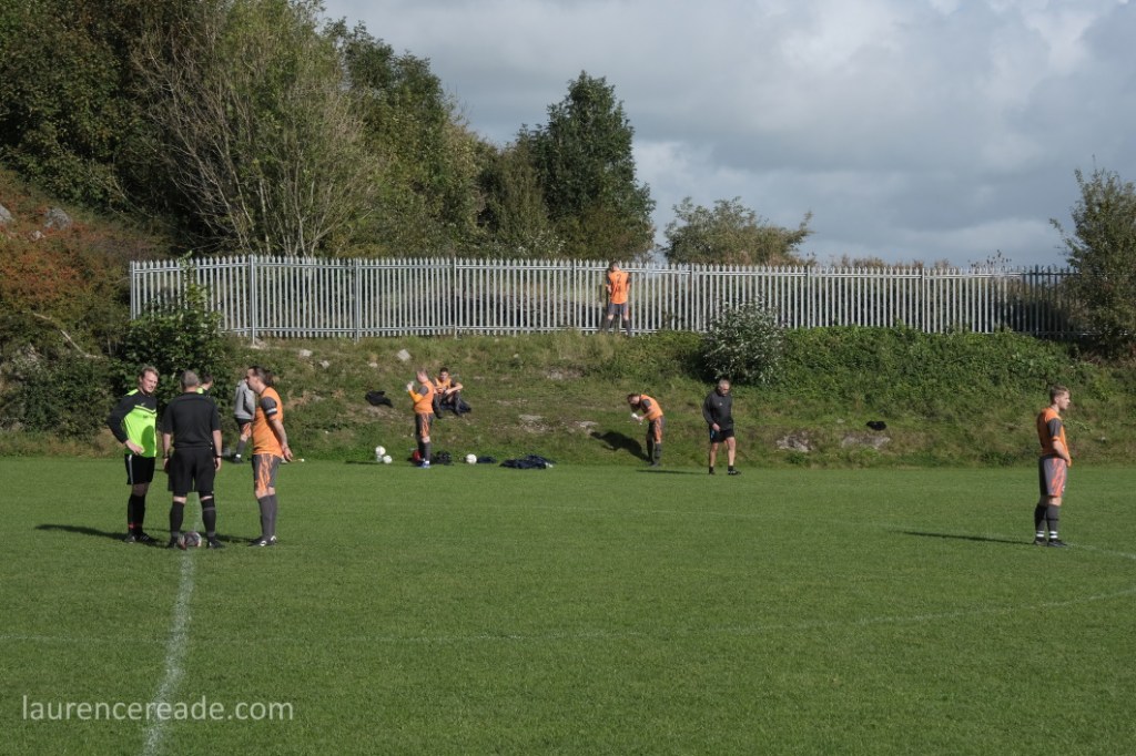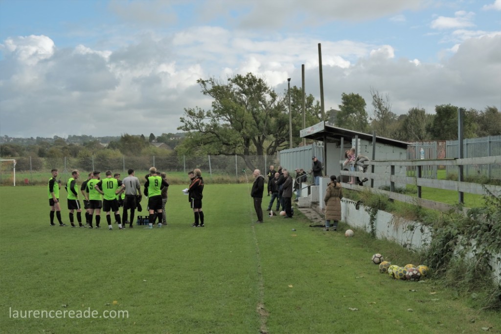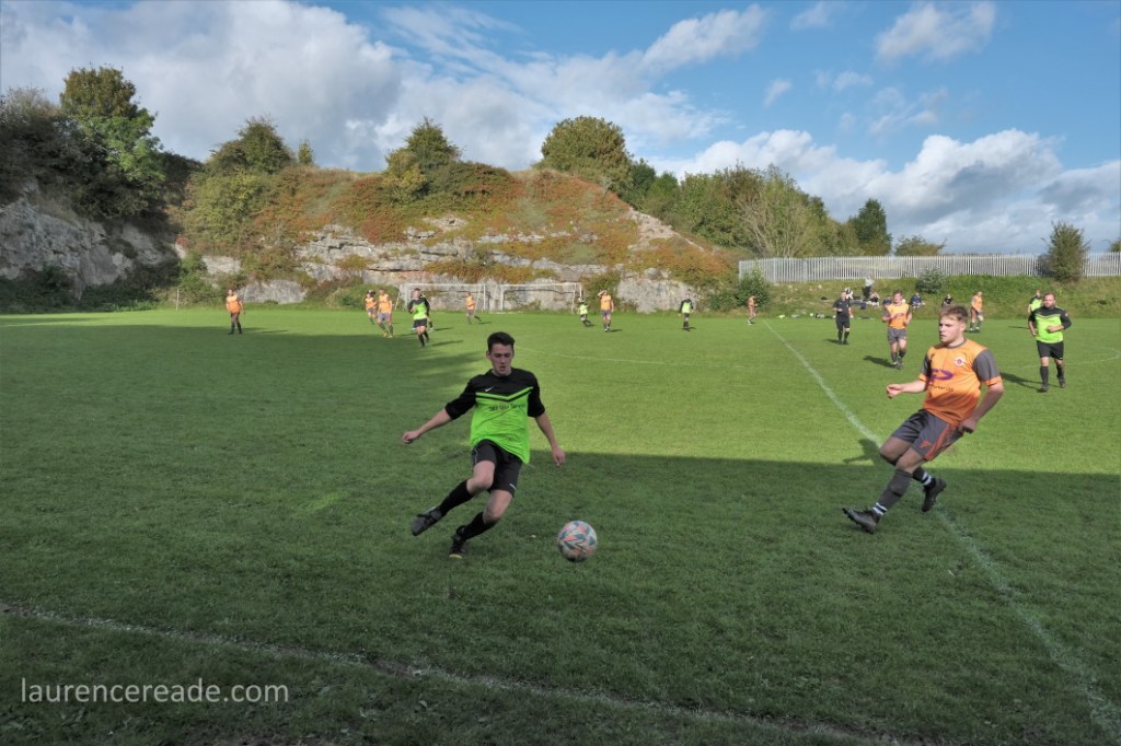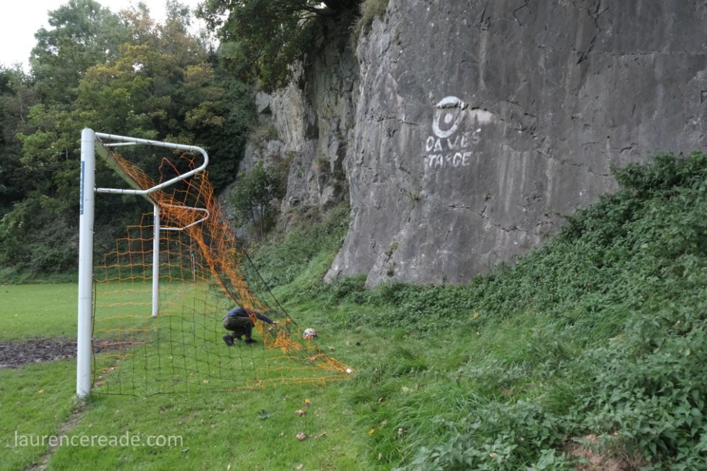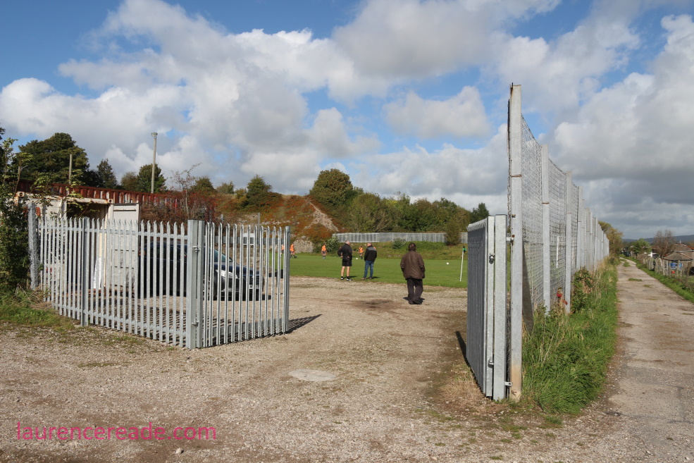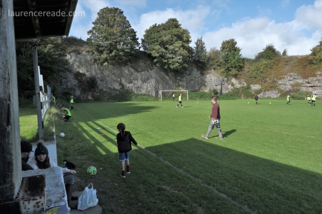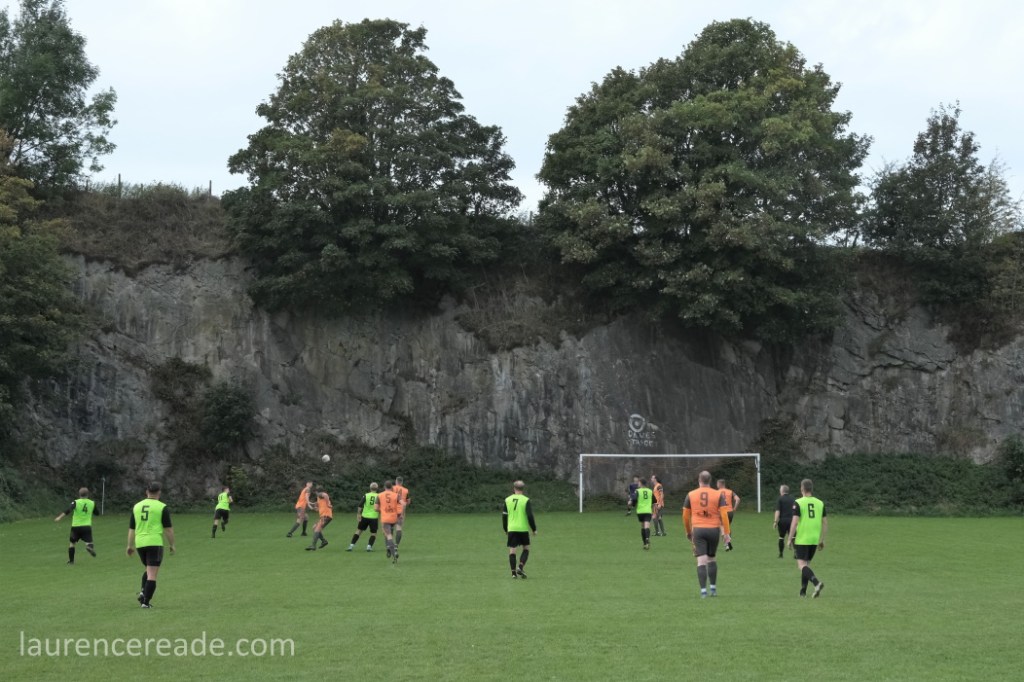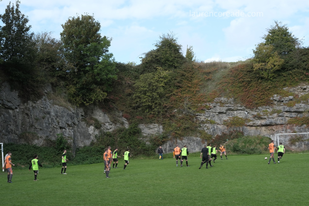 So what makes Iodine Park so special? Part of it is that is in an old limestone quarry, the rock face a sheer face behind one goal, and the name an ironic comment on treating the cuts made by bits of flint sticking up from the pitch. And of course, there’s Dave’s target, apparently that used to be Dom’s target, but when Dom left it was changed. But Dave’s now left too, and Dom’s wife told me he wants his name restored…Â