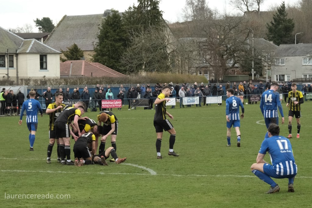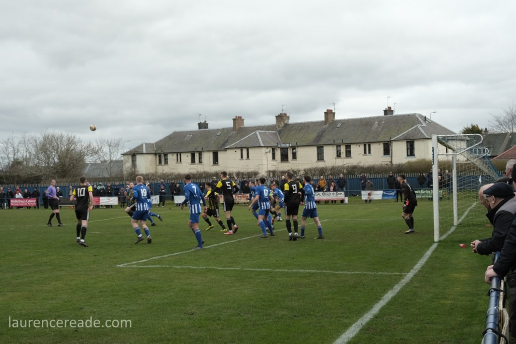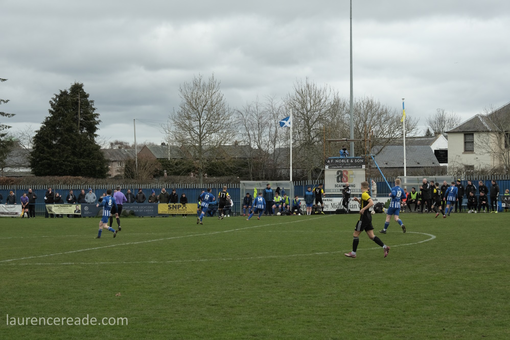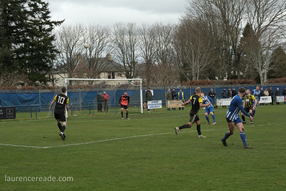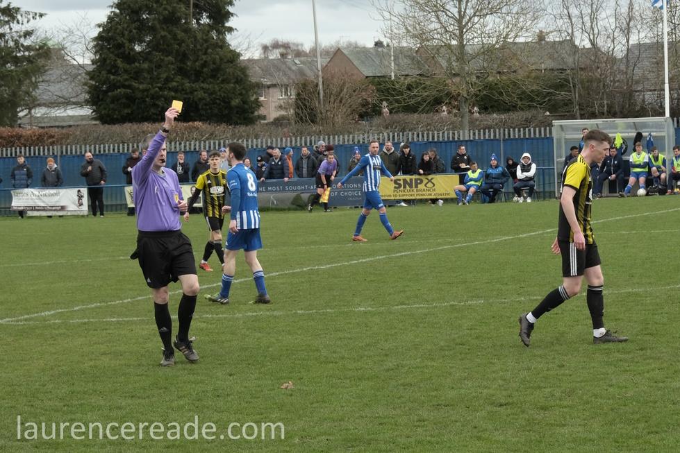 The game was settled by Joe Viola’s thunderbolt, which in turn had much to with Penicuik having to play much of the game with 10 men, Mair’s dismissal following the hop’s red card theme! That shouldn’t detract, by the way from Peniscuik’s excellence everywhere else.