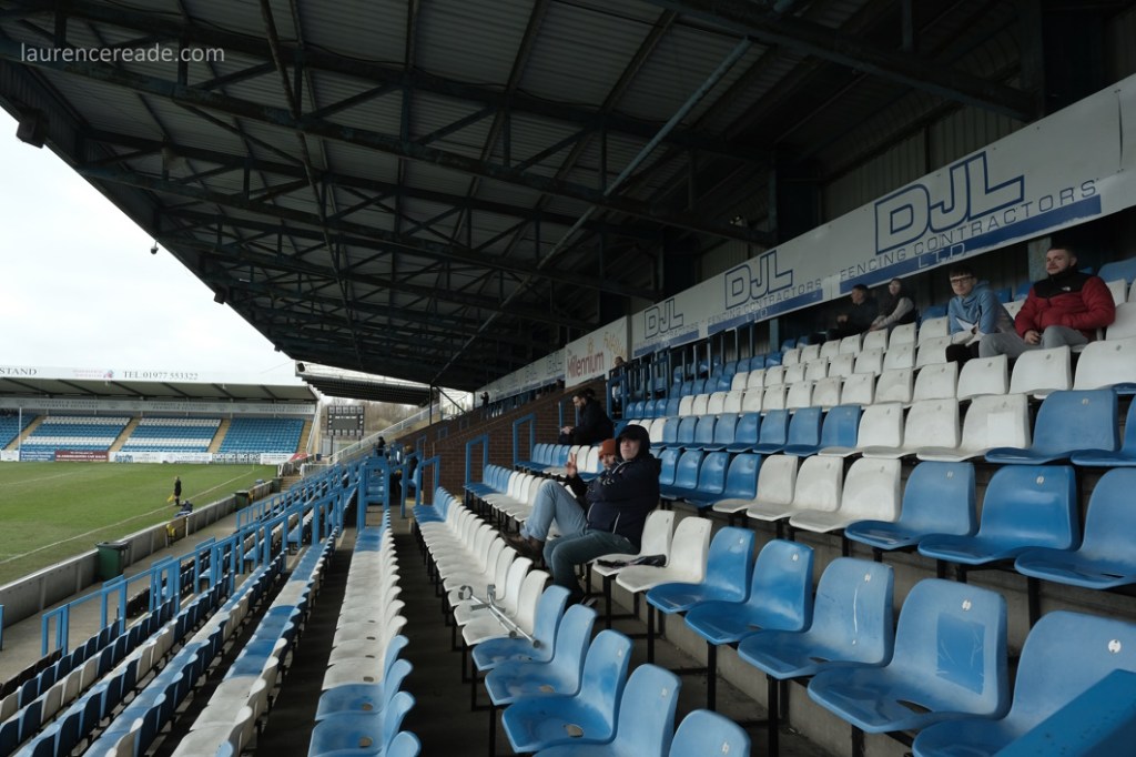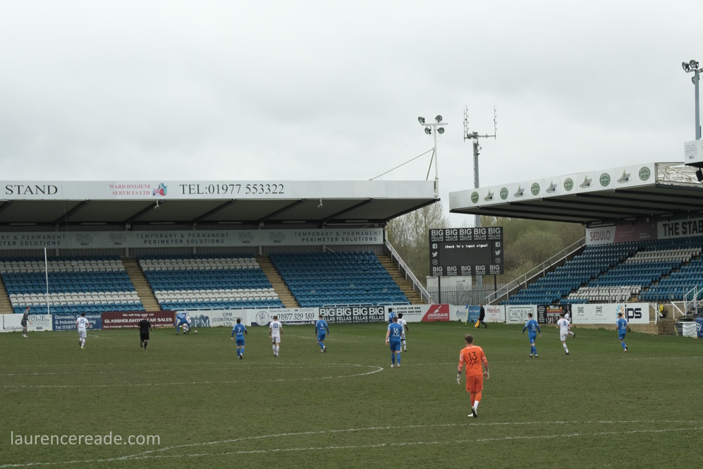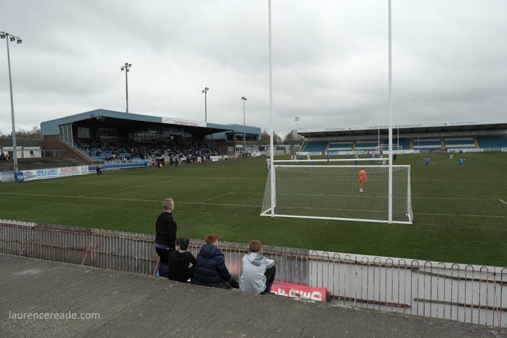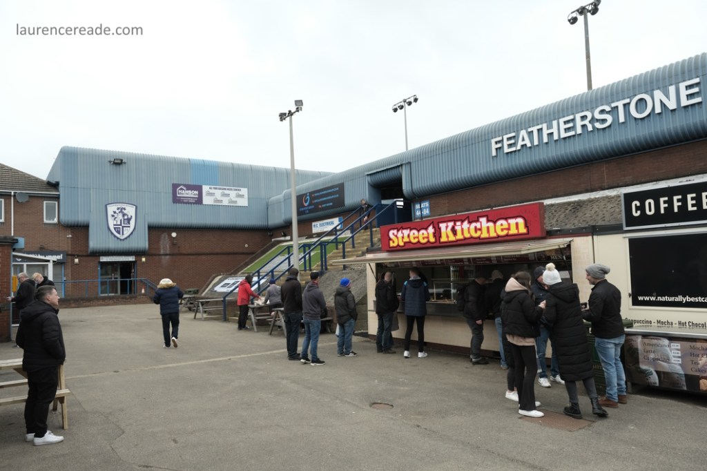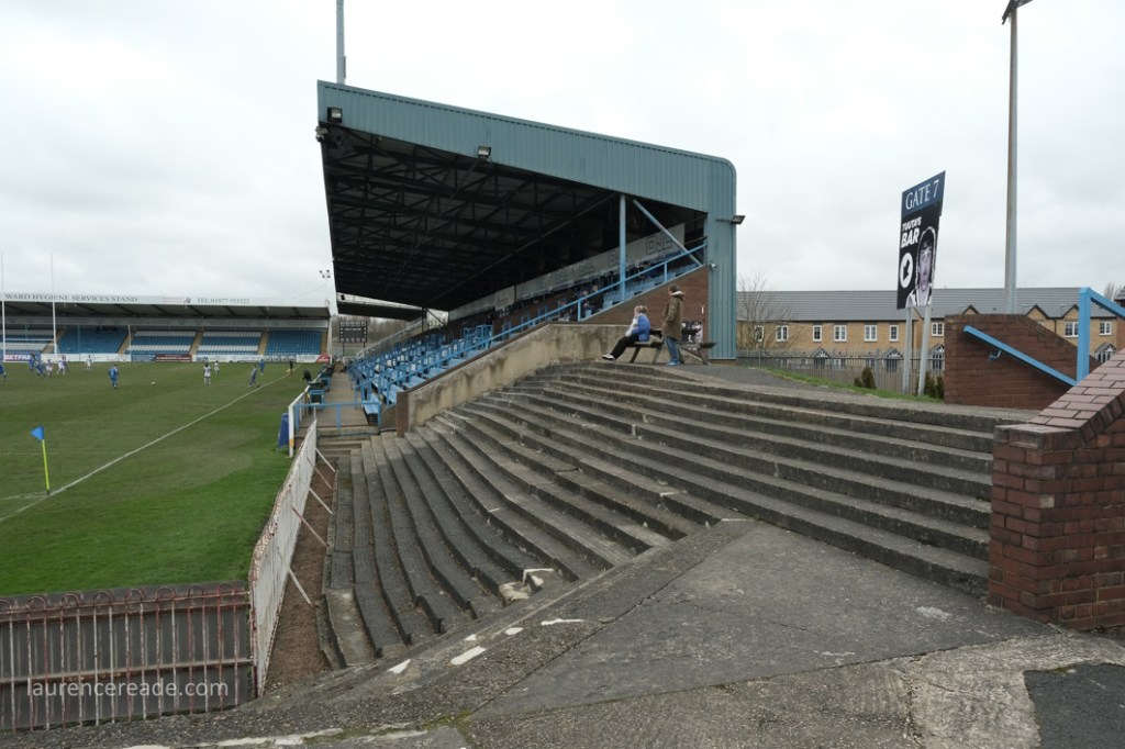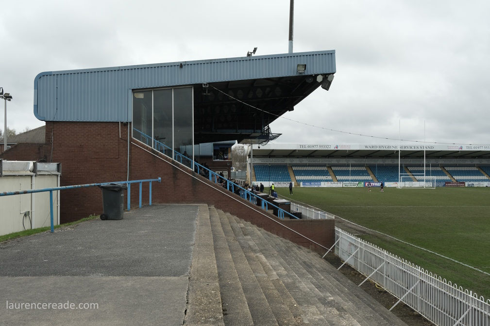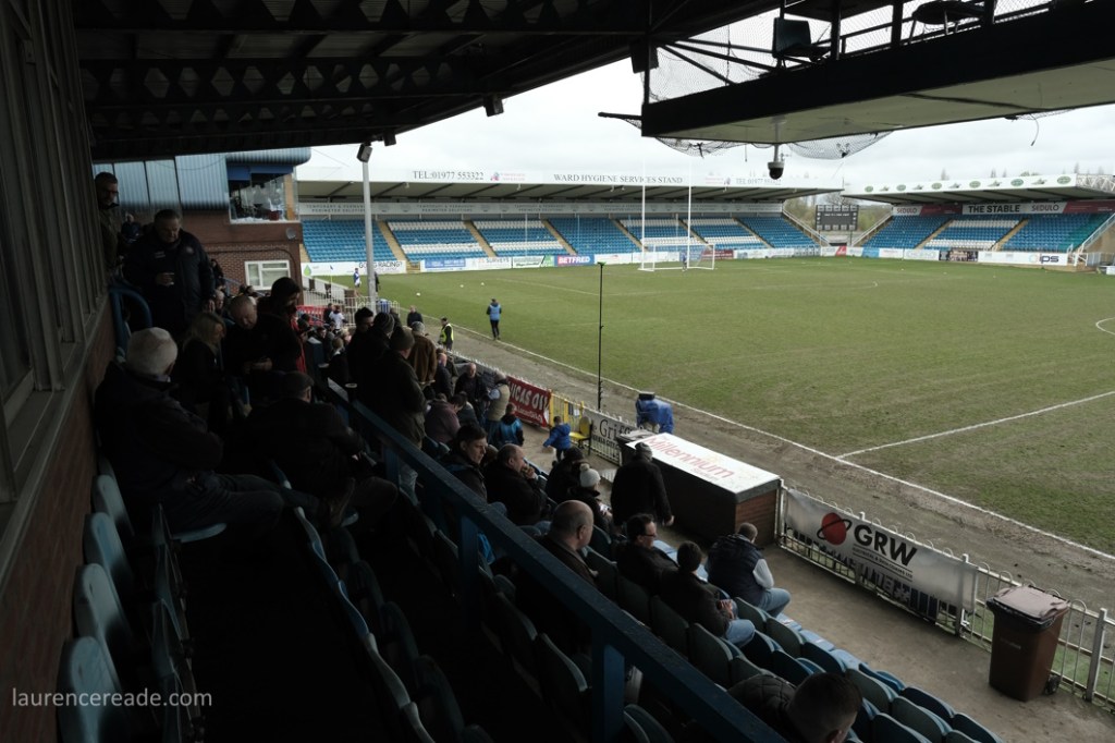 So this was the final opportunity to watch Association rules at a stadium used to hosting Rugby League Championship games, but fit for the Super League- Featherstone have made the last two “Million Pound Games” after all. There was also the opportunity to see the game played in front of two stands that originally were built for the old home of Scarborough FC, the McCain Stadium. When that club were bankrupted and the ground demolished Feathestone Rovers’ fans bought two stands, and they now sit either side of the scoreboard. I must admit, I did rather regret that I didn’t use either stand on my one visit to the McCain Stadium. I suppose I made up for lost time!
