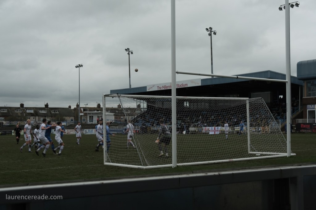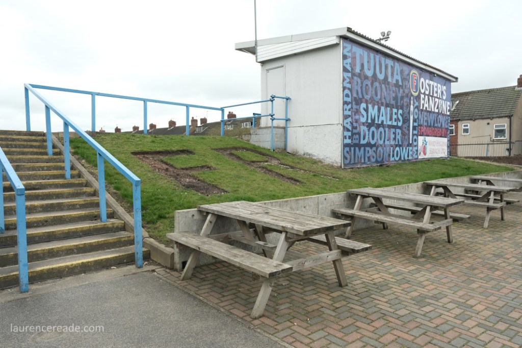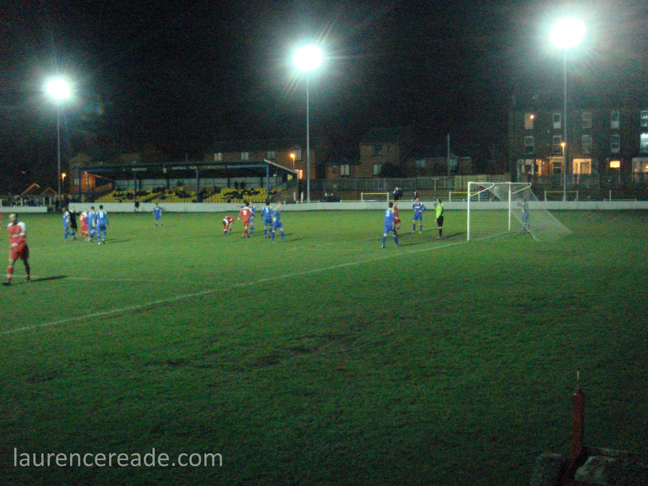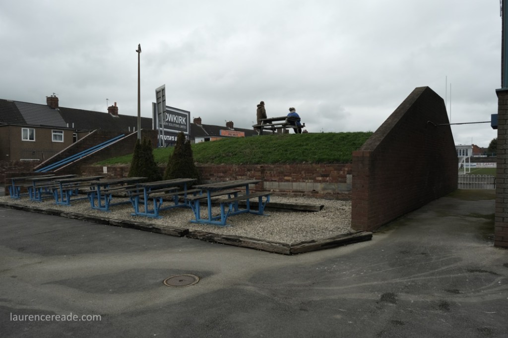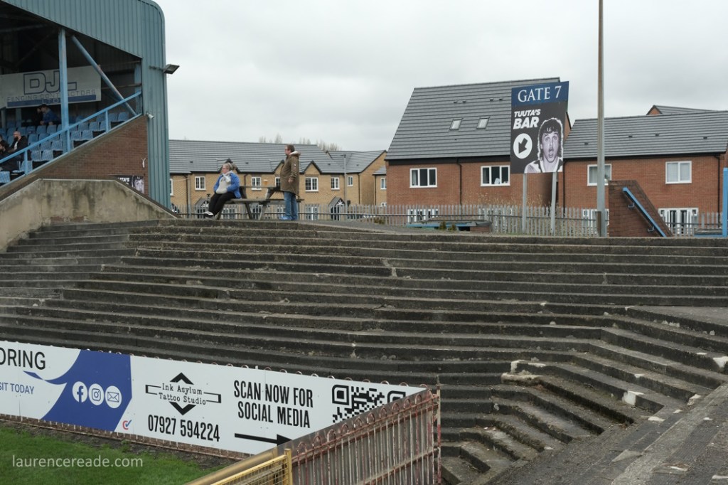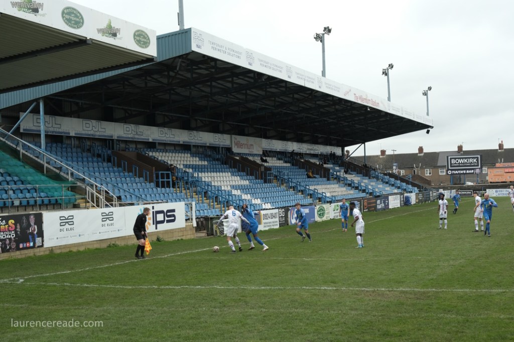 So this was the final opportunity to watch Association rules at a stadium used to hosting Rugby League Championship games, but fit for the Super League- Featherstone have made the last two “Million Pound Games” after all. There was also the opportunity to see the game played in front of two stands that originally were built for the old home of Scarborough FC, the McCain Stadium. When that club were bankrupted and the ground demolished Feathestone Rovers’ fans bought two stands, and they now sit either side of the scoreboard. I must admit, I did rather regret that I didn’t use either stand on my one visit to the McCain Stadium. I suppose I made up for lost time!