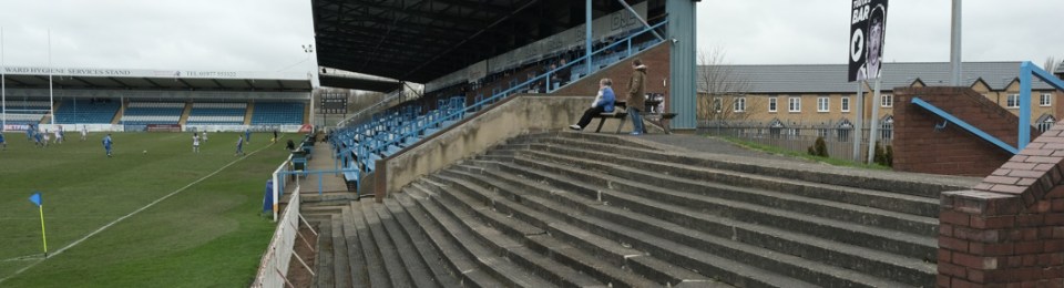 So this was the final opportunity to watch Association rules at a stadium used to hosting Rugby League Championship games, but fit for the Super League- Featherstone have made the last two “Million Pound Games” after all. There was also the opportunity to see the game played in front of two stands that originally were built for the old home of Scarborough FC, the McCain Stadium. When that club were bankrupted and the ground demolished Feathestone Rovers’ fans bought two stands, and they now sit either side of the scoreboard. I must admit, I did rather regret that I didn’t use either stand on my one visit to the McCain Stadium. I suppose I made up for lost time!