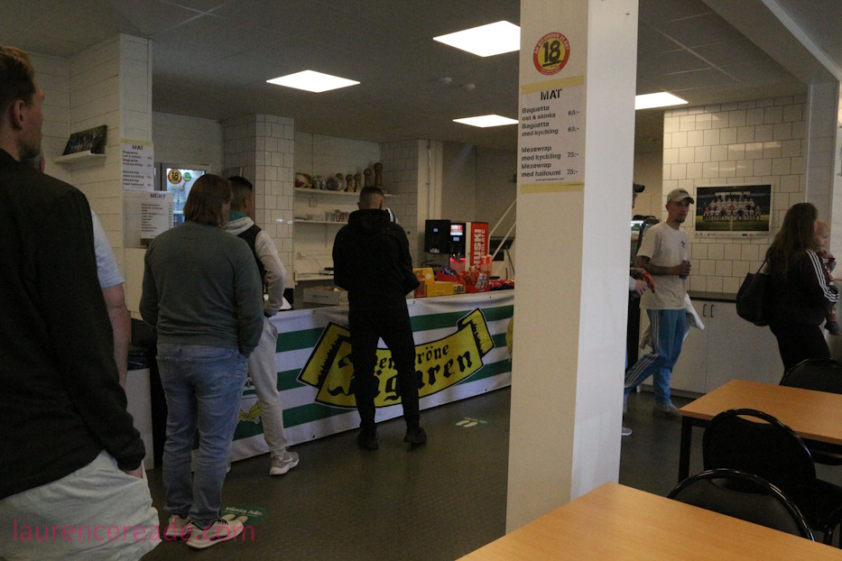 We made it comfortably in time for kick-off but being in the hop party did have some perks. Kim had pre-paid, so we were waved through at the gate, and had time even to buy the rather tasty filled rolls available in the clubhouse. Kim even found time to distribute a small token from the club, a Hammarby kit fridge magnet each.