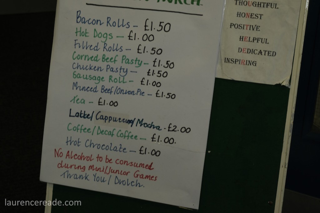 Robyn and I plonked ourselves in the clubhouse, and a queue soon formed for the catering as cold, wet groundhoppers sought to warm up. Inwardly I planned a takeaway later, thinking we’d never get served. I was proved wrong almost immediately as the queue moved rapidly, the club had thought long and hard about how to serve the throng quickly and made sure there were enough people to pull it off well.