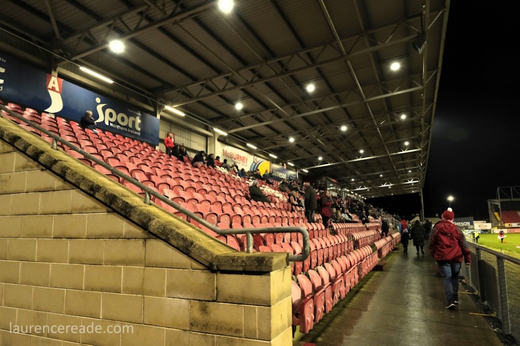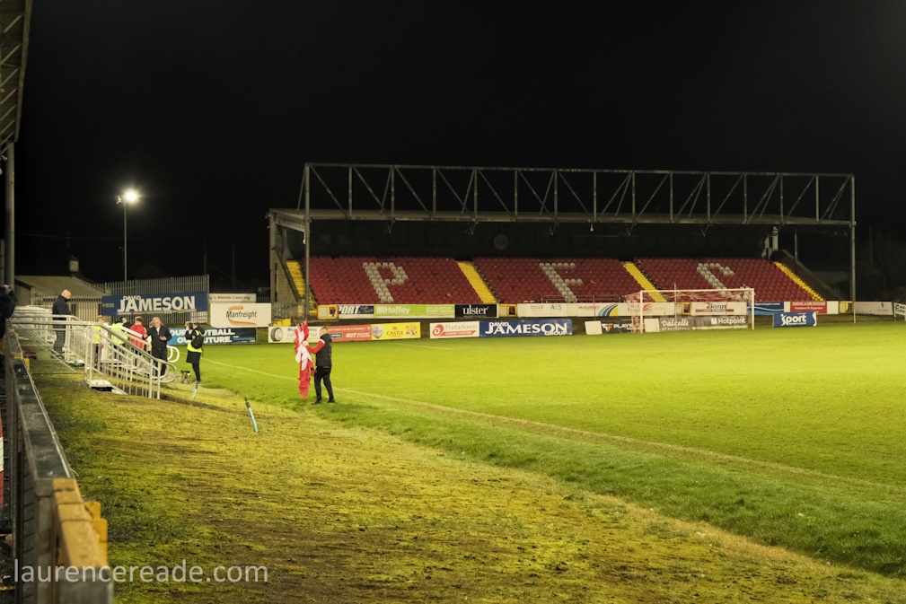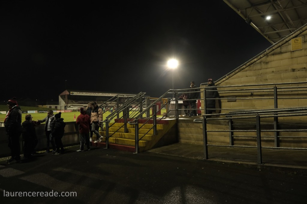 Shamrock Park reflects the club’s status and ambitions. Currently there are only two all-seater stands in use, giving a capacity of 2,770. Opposite the main stand is the old grandstand now disused, with plans afoot to demolish it. The idea is to build a 1046 seater stand and convert the pitch to 3G. The open end to the north would see a domed structure enclose the current training facility there.