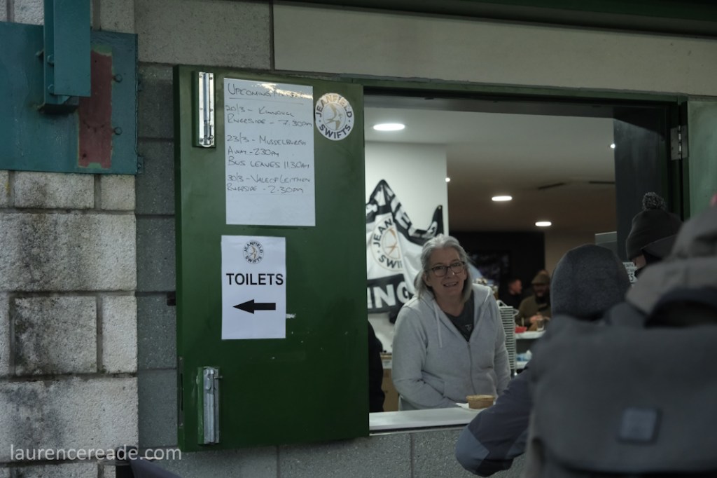 If you take the River Tay as being the border between the territories of the Highland and Lowland Leagues, then I’d say Jeanfield’s Riverside home is as close as GroundhopUK have ever been to a Highland Hop, but 3 games into our Saturday, I was just grateful that groundhopper/ meteorologist Chris Garrett had got his forecast spot on. He’d predicted no rain for the first two games, with us getting wet after 6pm. I spotted the covered terrace on the near side and made a mental note, yes the rains did arrive at exactly 6…