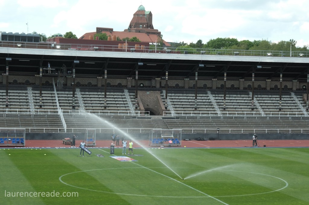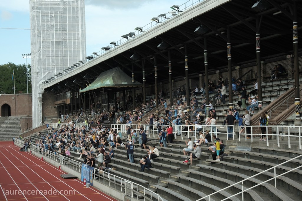 The stadium has byggnadsminne, or listed status guaranteeing its long term future, but has had a refit since my last visit. Somehow they’ve managed to increase the running lanes from 6 to 8 so major athletics meetings do still happen here, and when that happens the football gets switched, either to Kanalplan or when the refurb is complete, Kristinebergs.