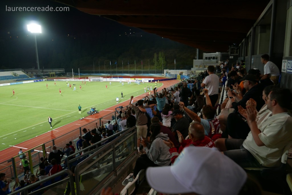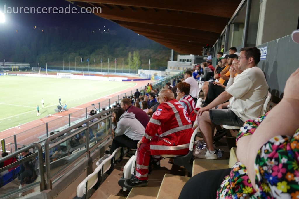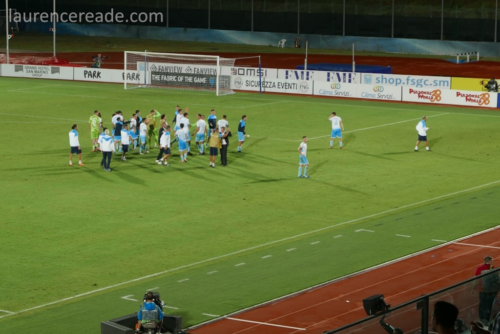 With all that history noone could confidentally predict that San Marino could defend their slender lead. That fact that they did was due a slew of defensive substitutions with goalscorer Sensoli quickly sacrificed, but also due to Liechtenstein failing to put statistically the world’s worst national team under anywhere near enough pressure. That said, the collective intake of breath when the referee indicated 7 minutes of stoppages was a fair indicator of just how much tension everyone there was feeling. I’d go as far as to say I’ve never felt tension like it at any other game I’ve watched as a neutral. Even a goal kick was roundly cheered.