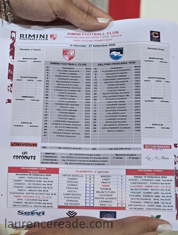 Of course not every game can be a classic and there was no shame in Rimini losing to a side currently top of the table and I do suspect Pescara see themselves as a Serie B side in waiting anyway. With no taxis or buses visible Robyn and I strolled back to our hotel through deserted streets. Wherever you are in the world it is always odd when you experience that contrast in atmosphere in such a short space of time.