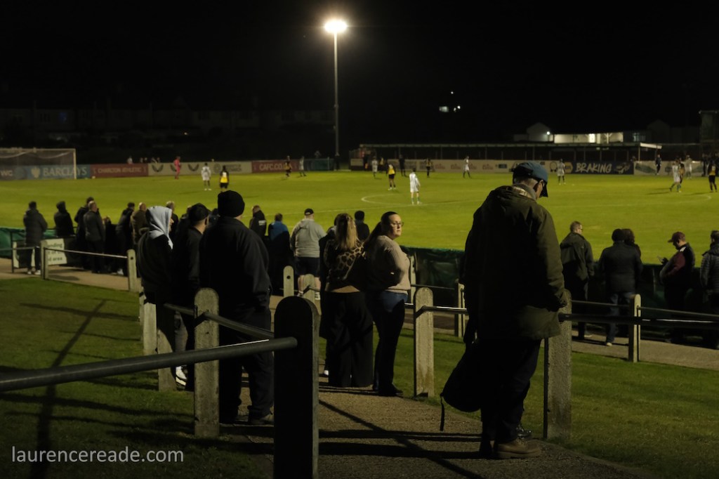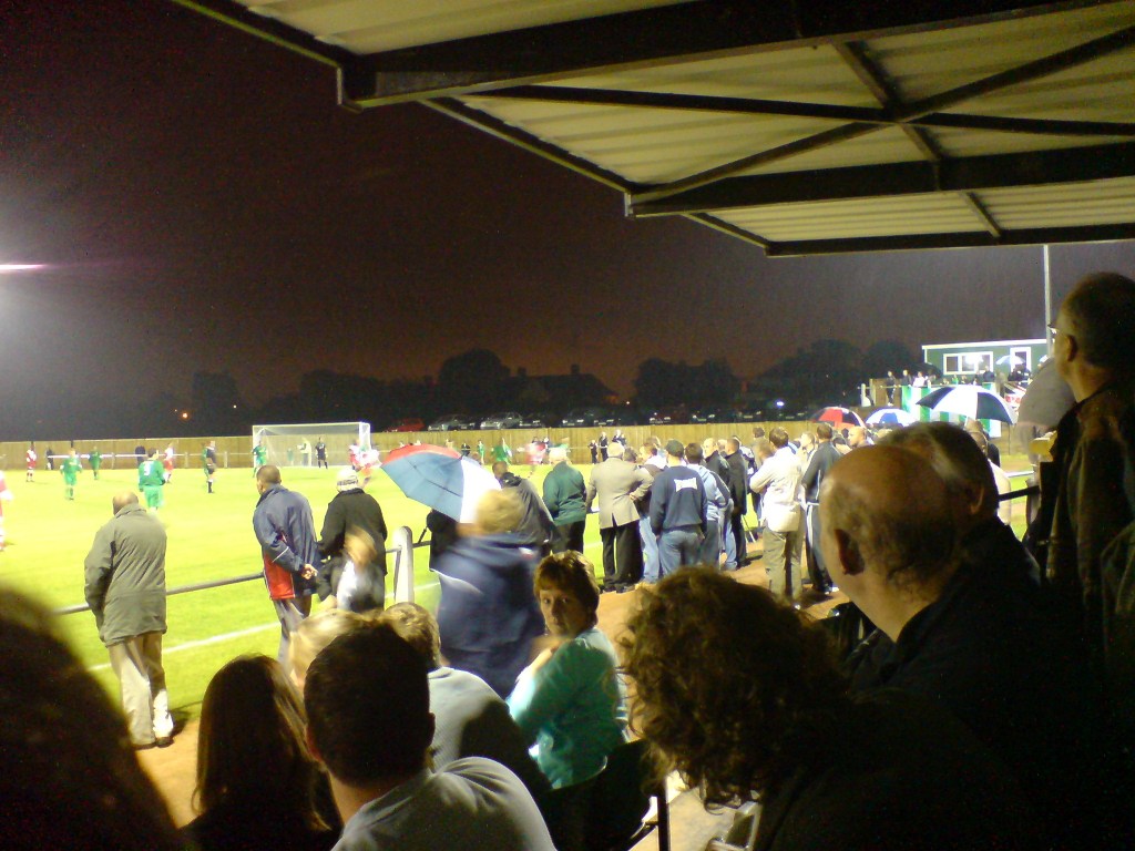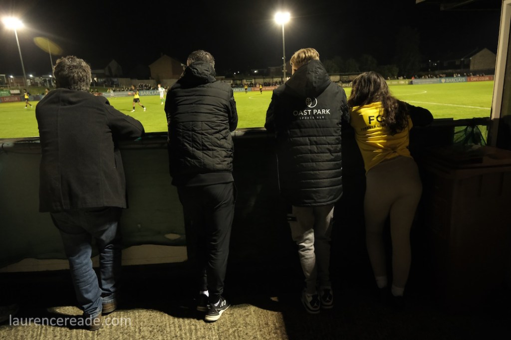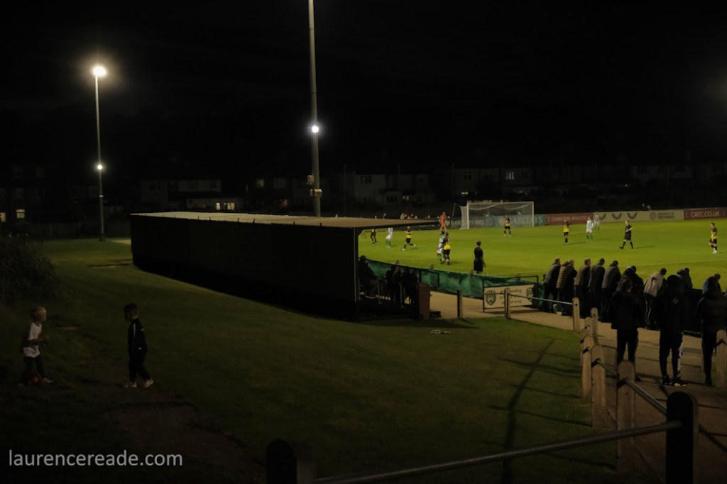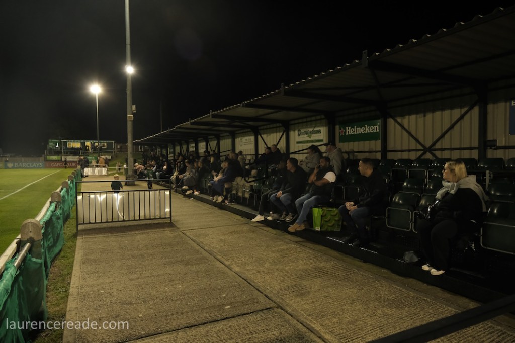 It was obvious once I’d got through the turnstiles that we were going to see a large crowd. Many positioned themselves high up on the banking if only to see the floodlights at Phoenix Sports no more than a couple of hundred yards away. In a sense it was a shame we couldn’t have paired the two clubs, but this is a SCEFL hop and they’re in the Isthmian League.