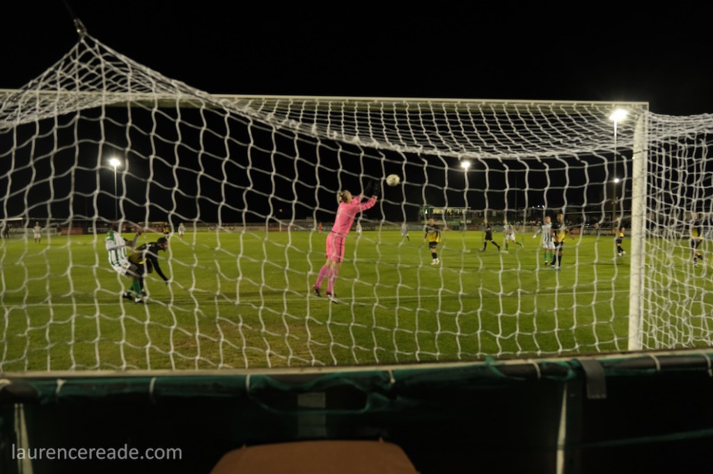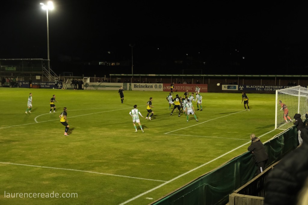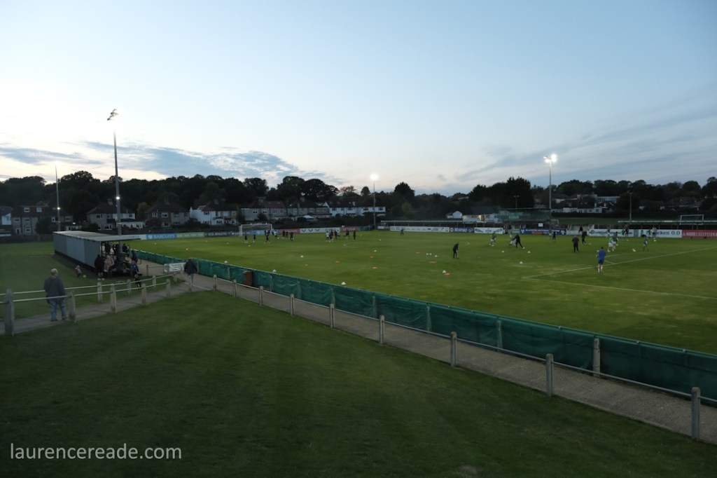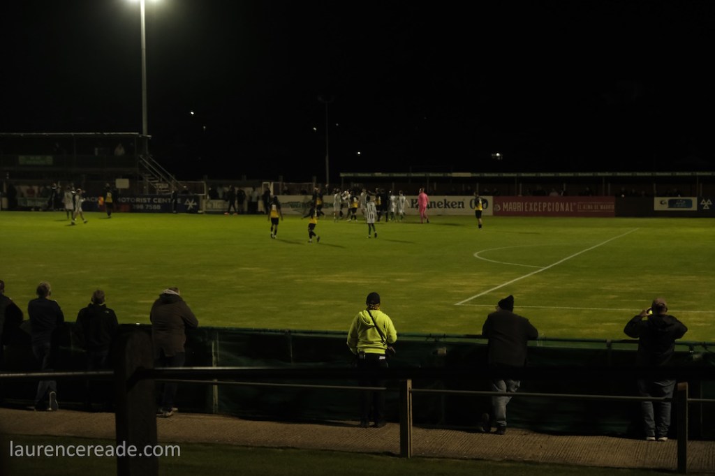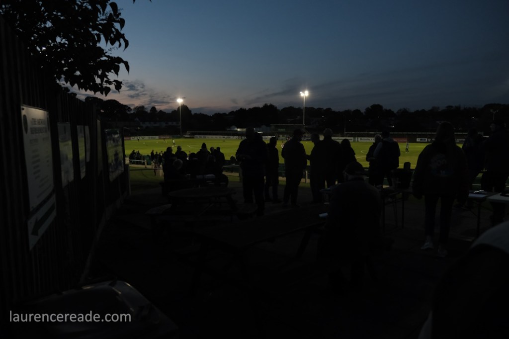 It was obvious once I’d got through the turnstiles that we were going to see a large crowd. Many positioned themselves high up on the banking if only to see the floodlights at Phoenix Sports no more than a couple of hundred yards away. In a sense it was a shame we couldn’t have paired the two clubs, but this is a SCEFL hop and they’re in the Isthmian League.