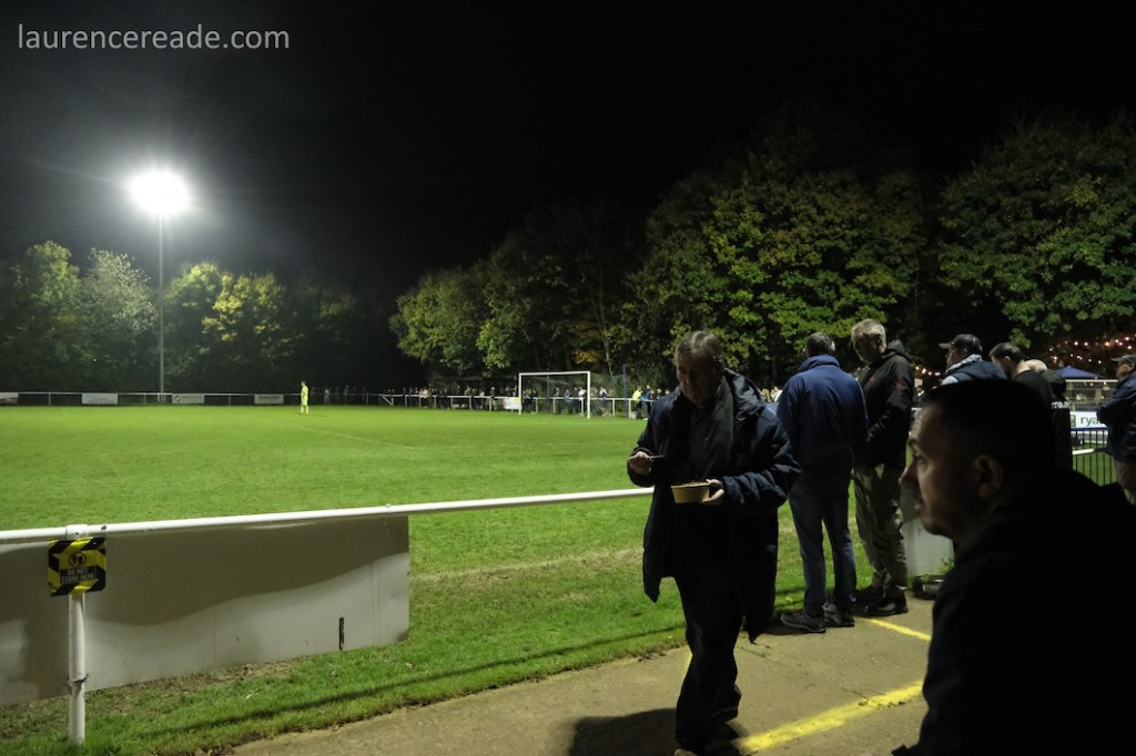 The impact as the sun set was to give the area between the clubhouse and the pitch the feel of a grotto, with the lights strung up between the trees. With the floodlights on the whole scene took on an ethereal beauty. You can well see why the ground is nicknamed “The Theatre of Trees,” although Loxwood I’m sure would argue that Plaistow Road could also lay claim to the title.
