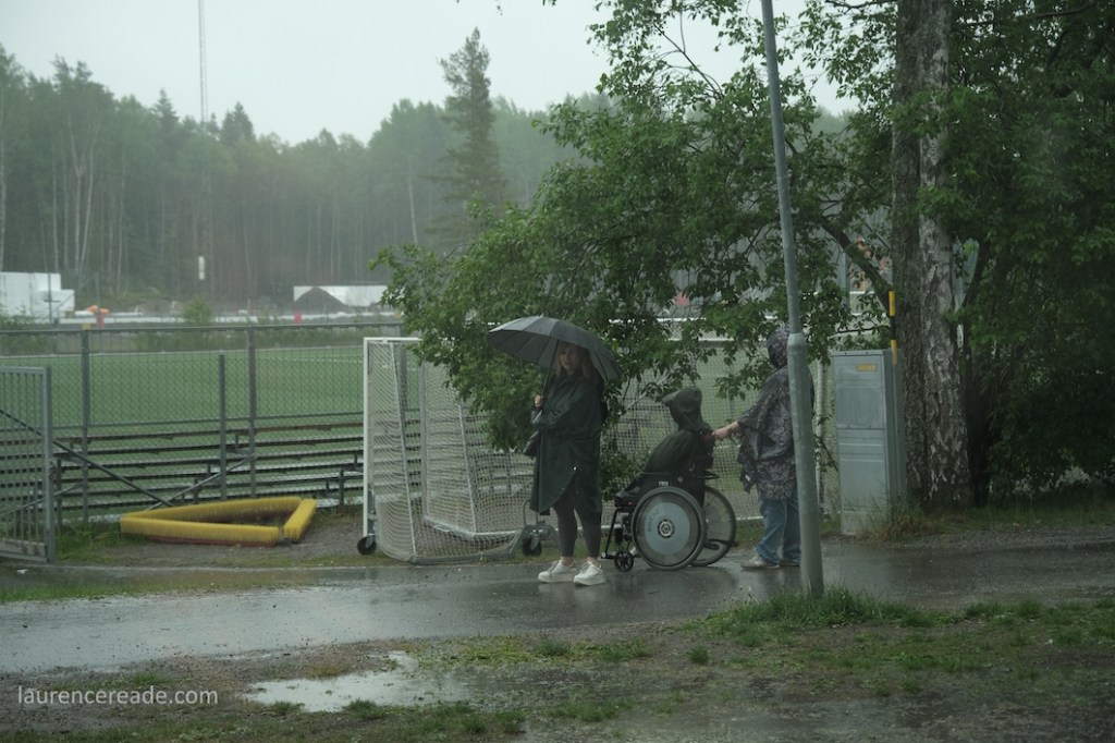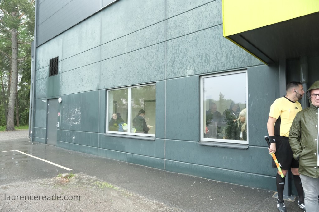Over the years I’ve visited no end of idrottsplats like Myrsjö I.P. They’re not the most preposessing of places, but there’s a lot to be said for a set of bleachers and a treelined backdrop. The issue here was that for the majority of the game it hammered down with rain, some sensibly sheltered. I decided to brave it, knowing I could dry out back at the hotel.