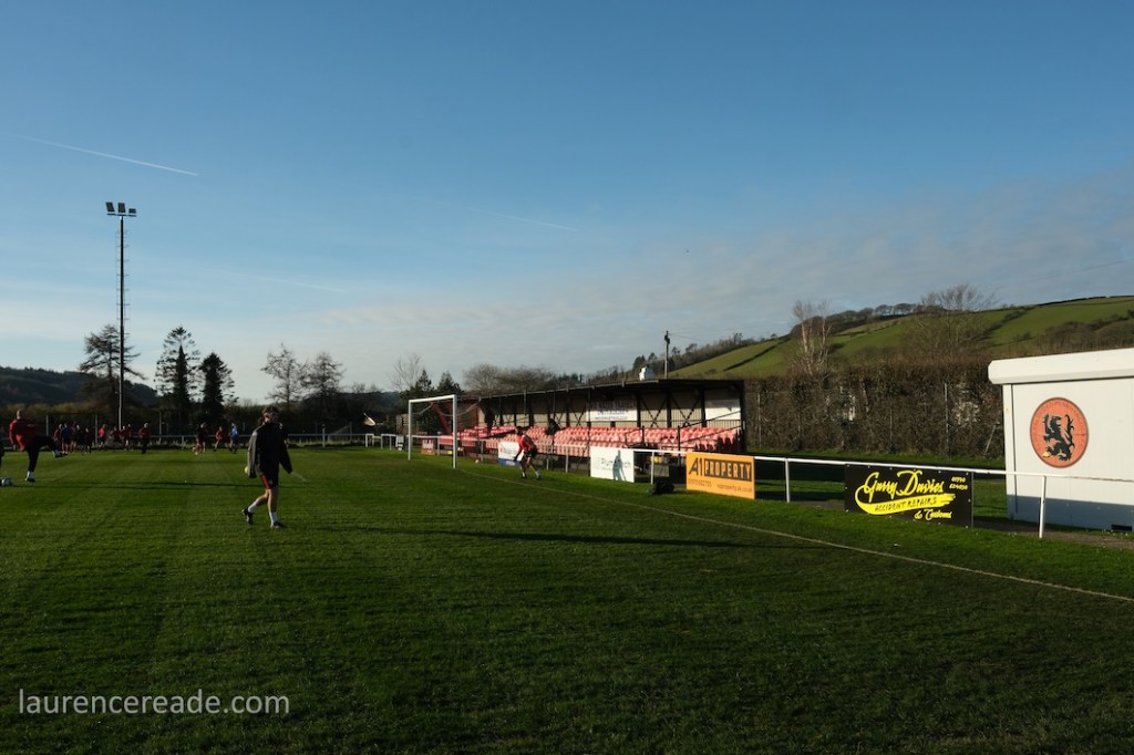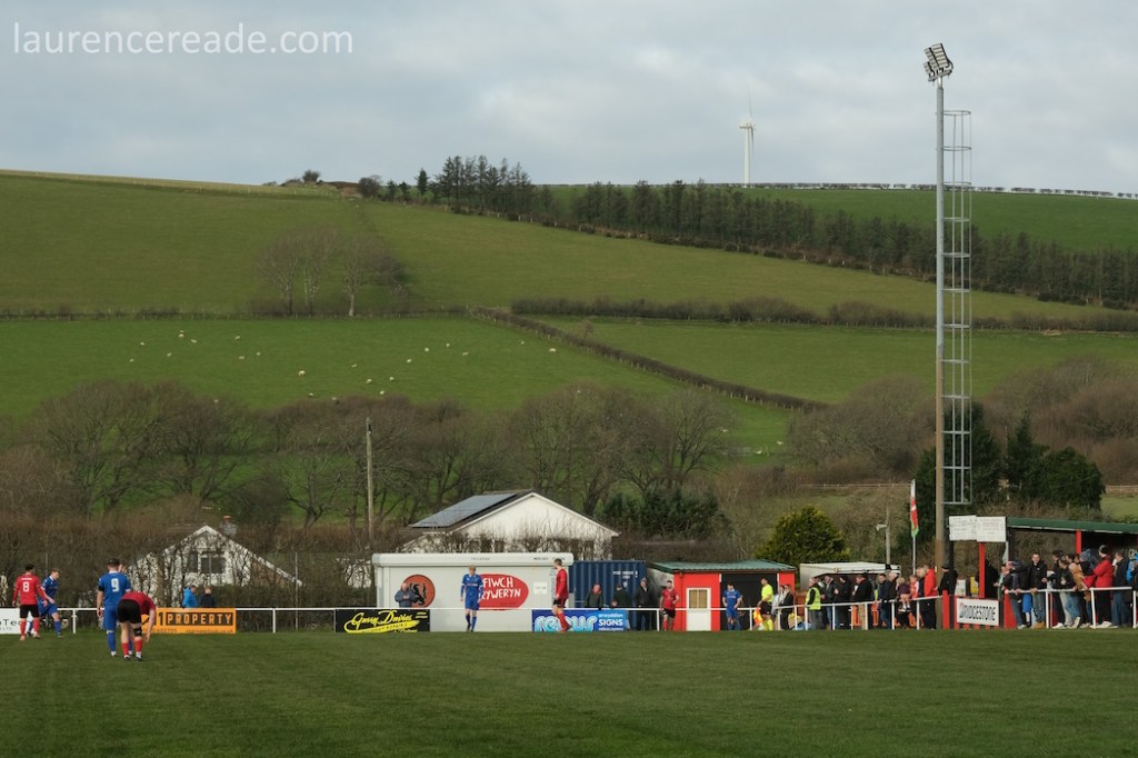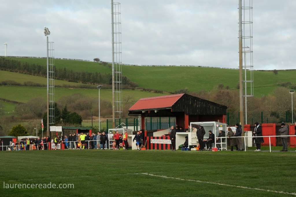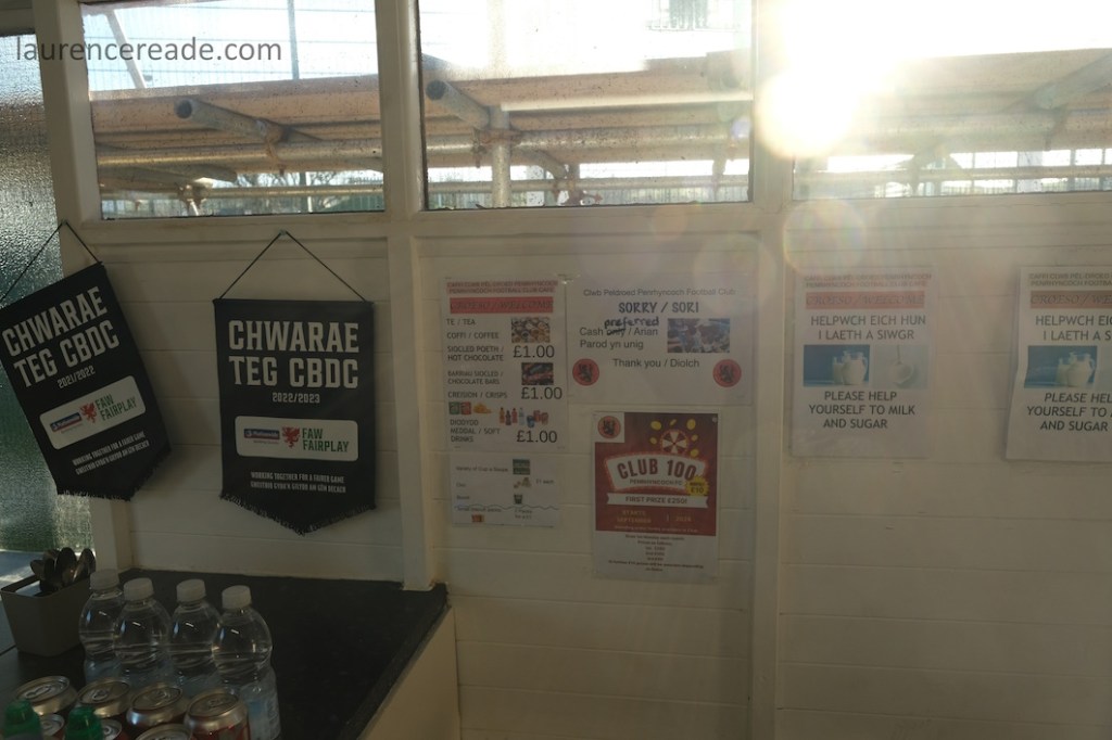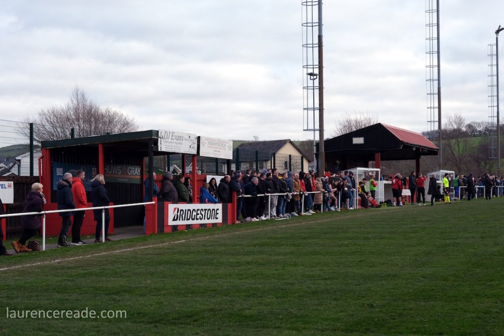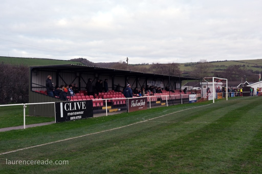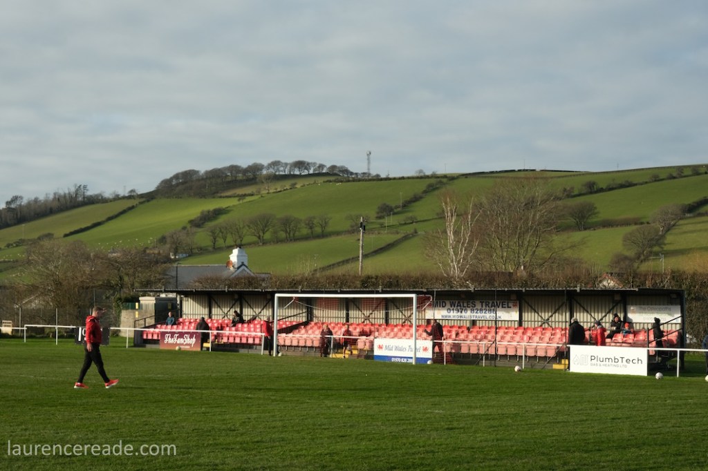 The Roosters have been around since 1965 and have always played at Cae Baker with the club gaining a lease from Ceredigion County Council in 1975. The ground is named after John Baker, an 18th-century farmer who previously farmed the land. Even now the ground sits with agriculture as its backdrop. I did note that the shepherd, with his dog, and Land Rover, didn’t pause to watch the football, while coralling the sheep!