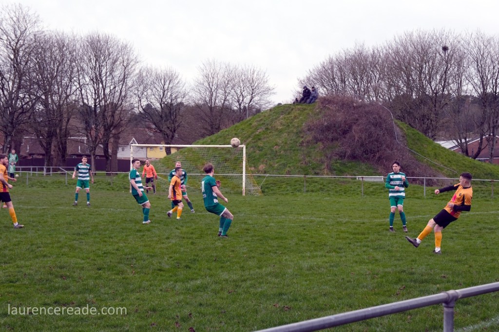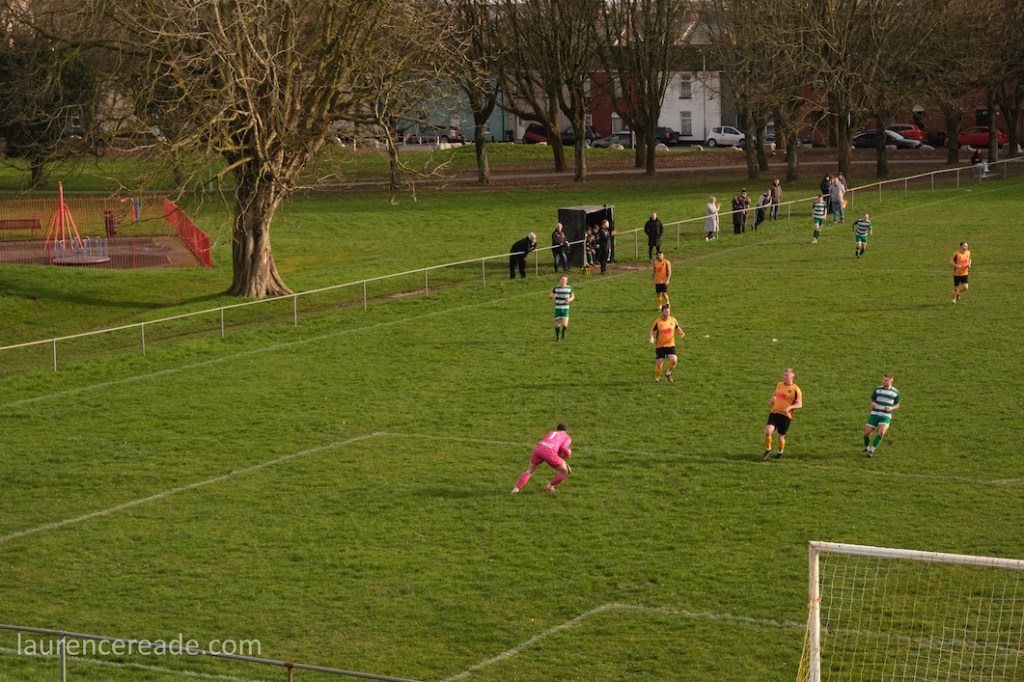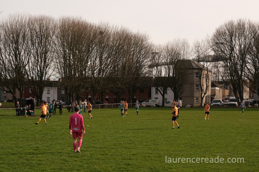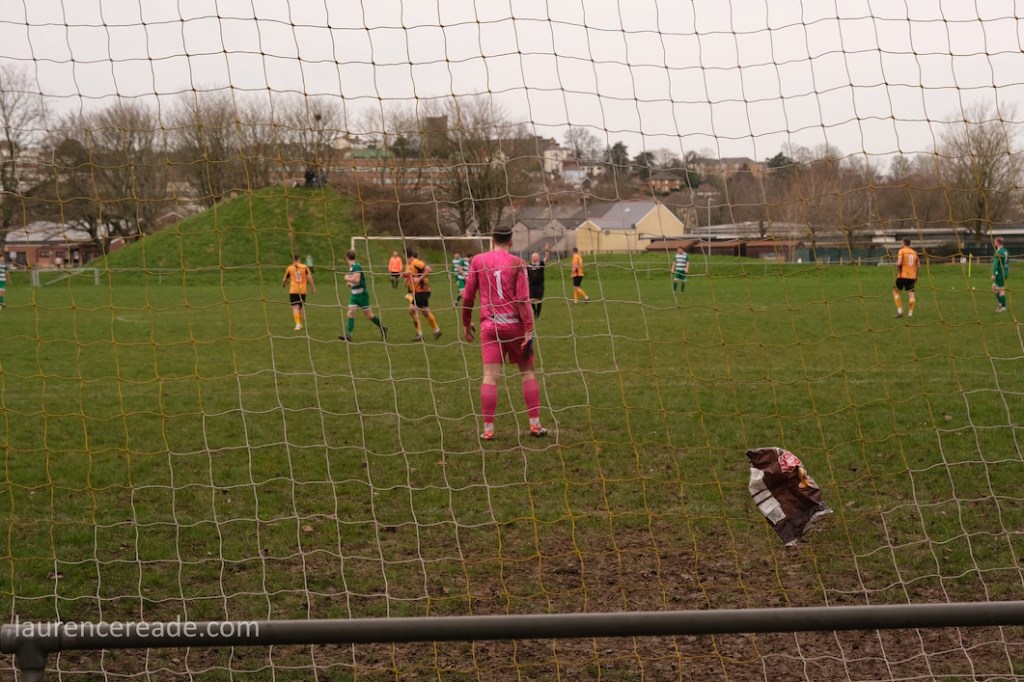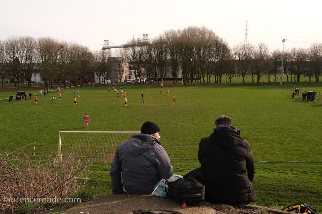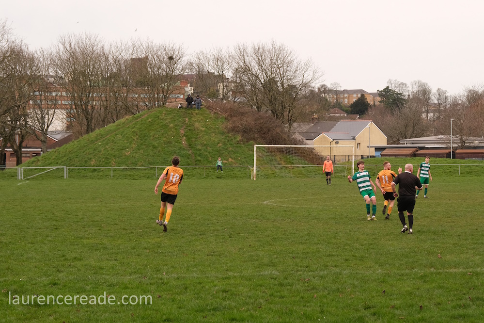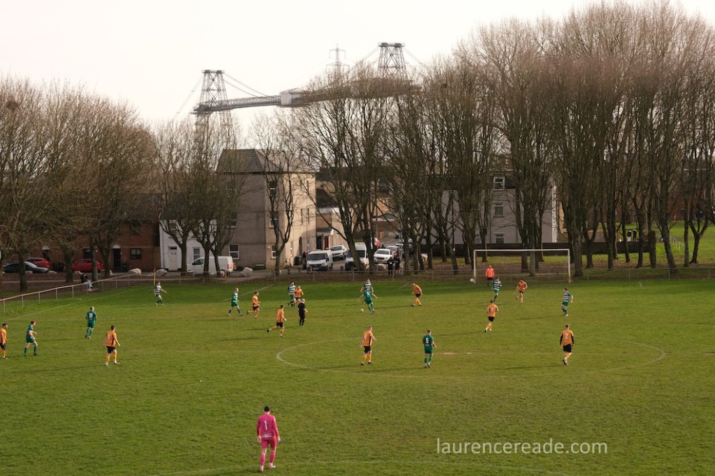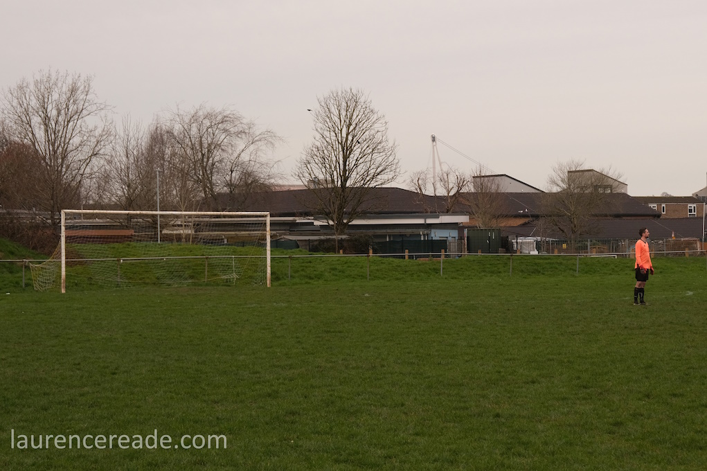 Pill returned to a facility for both football and rugby and just over the street the 2nd XI played a fixture that I’d have been tempted by had the game times not overlapped. What makes the firsts’ pitch interesting is the man-made hillock behind the near goal. By the looks of it, it was built as some sort of drainage access, but there is a path up to the top, and the view from the top is superb, and if you want to get the transporter bridge in your photos that’s where you head. I could have watched the entire game from there!